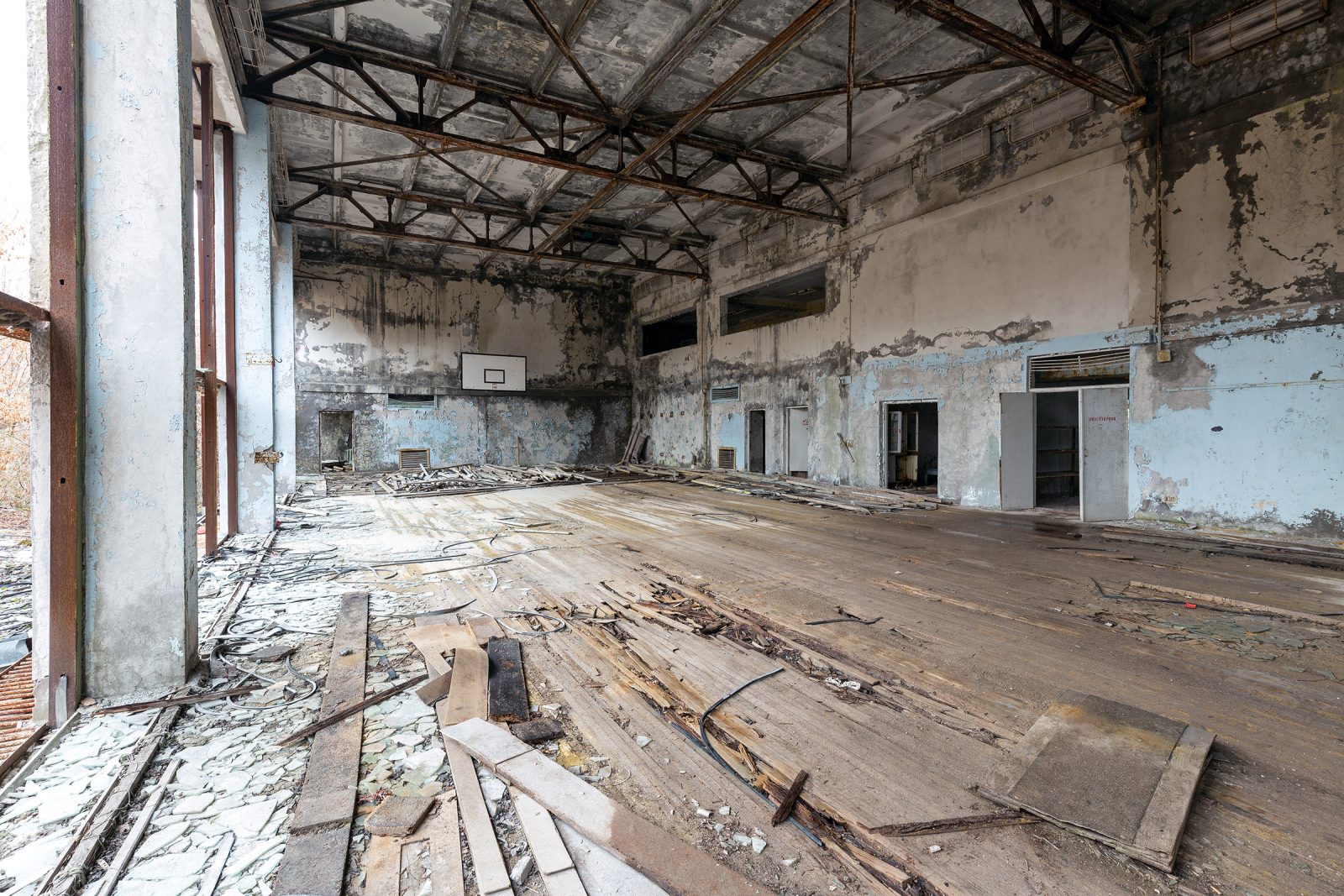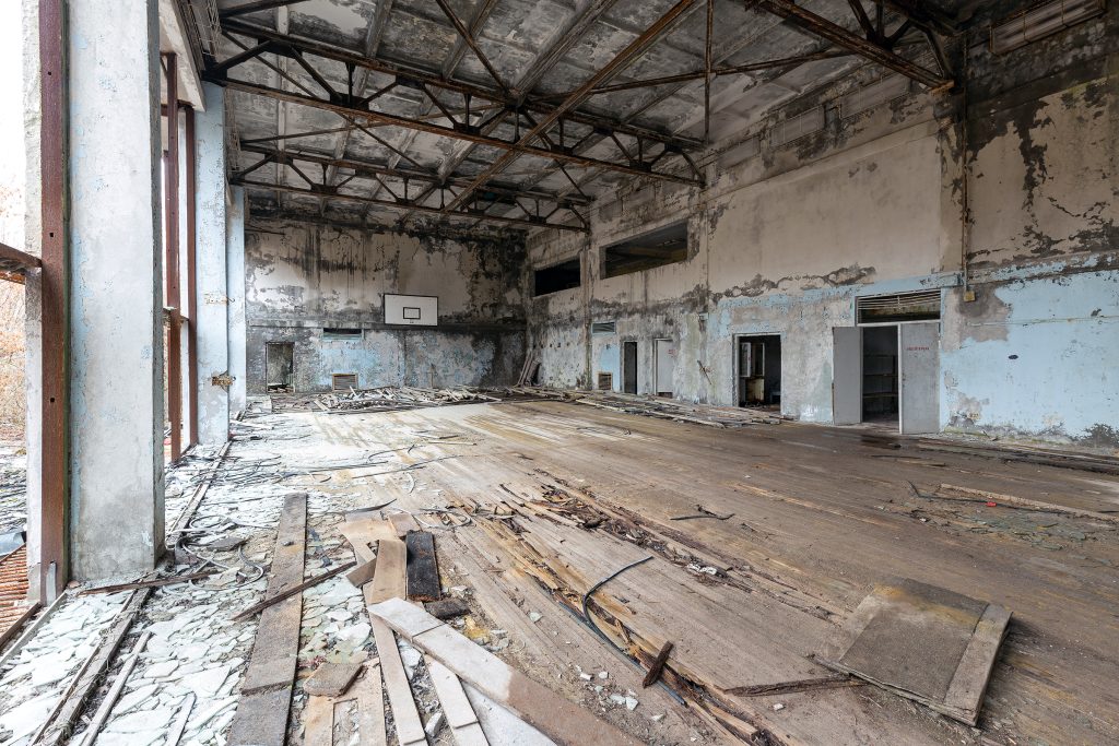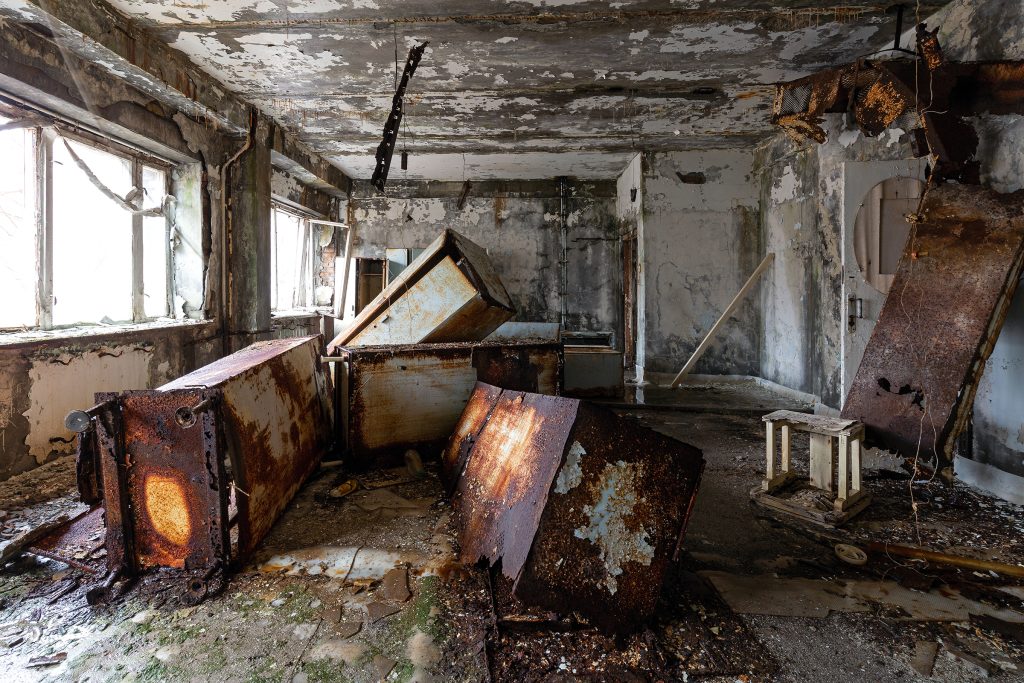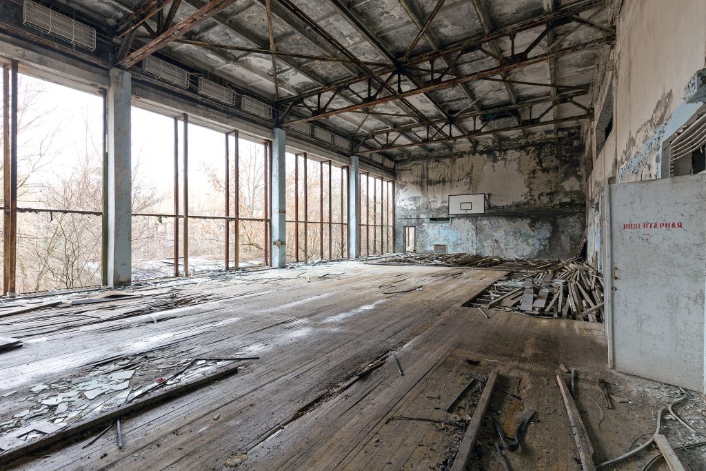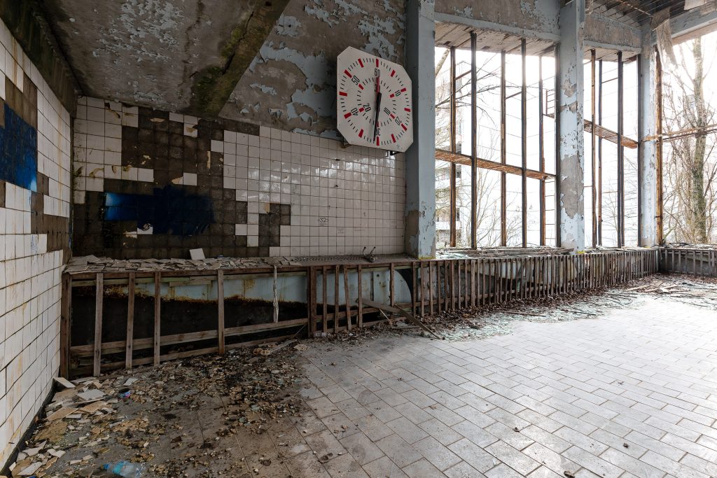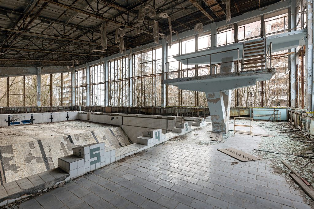Le 26 avril 1986, l’accident de Tchernobyl bouleverse tout. La ville est évacuée en quelques heures le 27 avril. Pourtant, contrairement à la plupart des bâtiments, la Piscine Azure reste en activité pendant 12 ans supplémentaires, jusqu’en 1998. Elle devient alors un havre pour les liquidateurs (les travailleurs chargés du nettoyage de la zone). Considérée comme l’un des endroits les plus propres de Prypiat, elle leur offrait un rare moment de normalité et de détente au milieu du chaos radioactif.