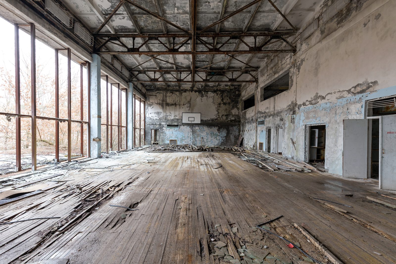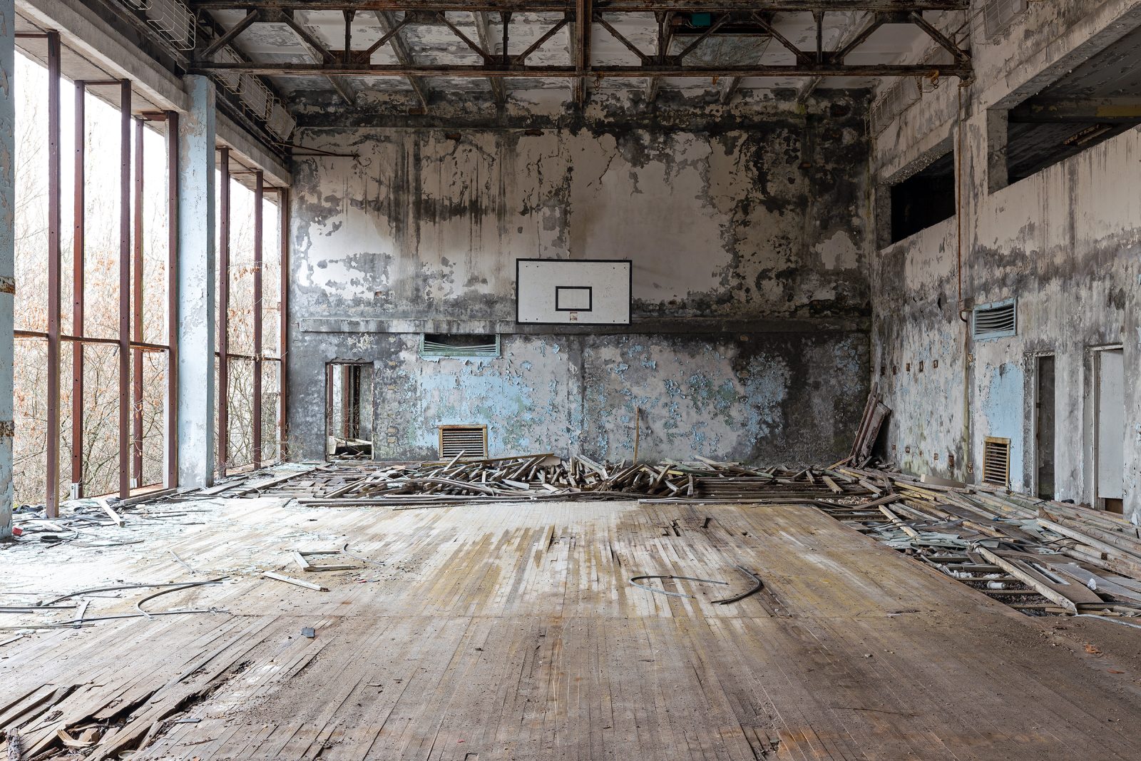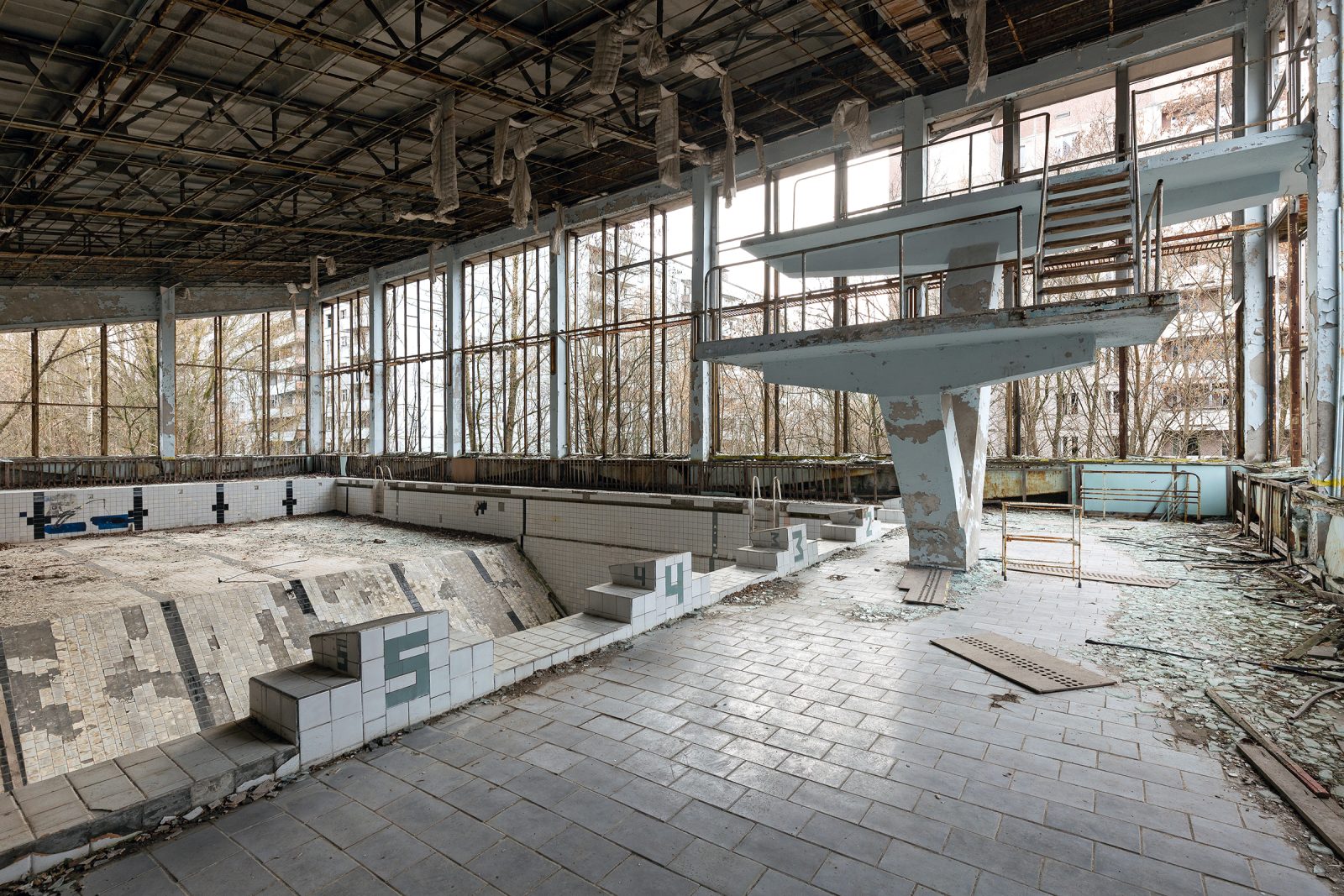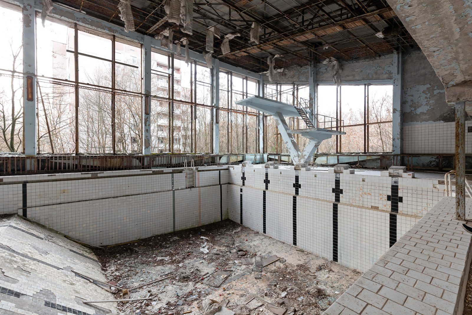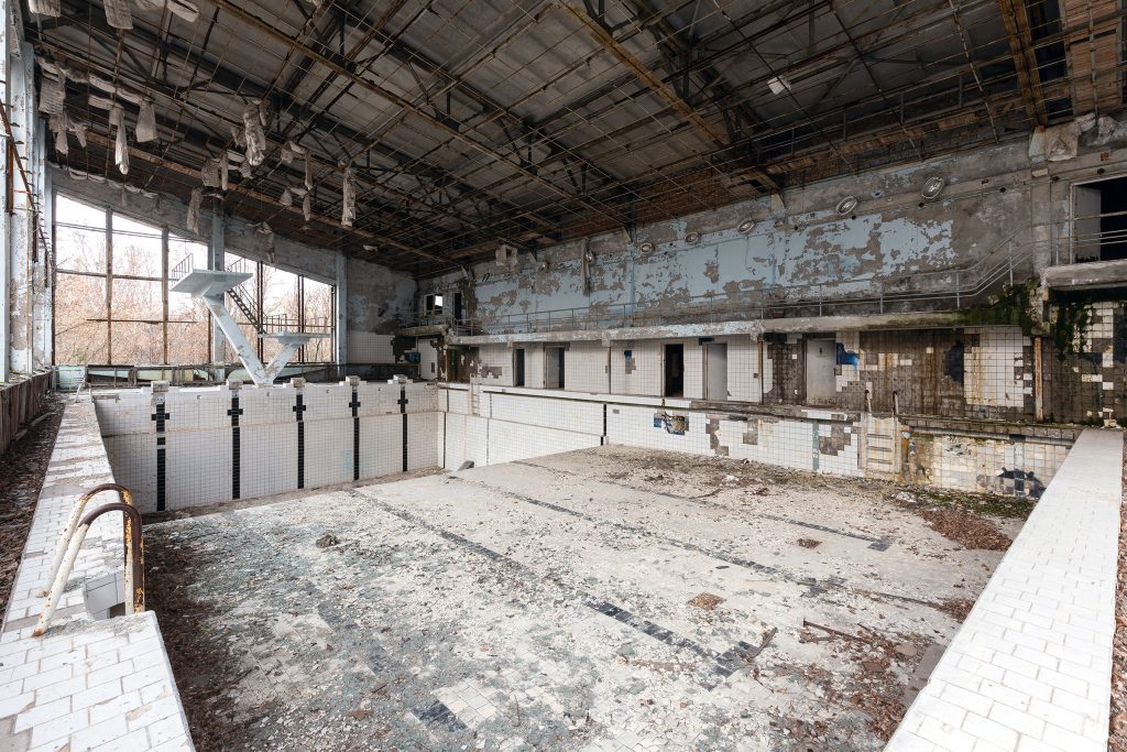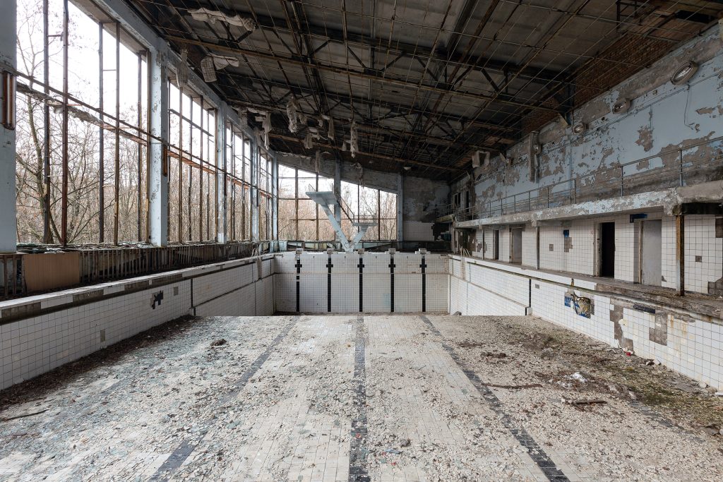 Construite dans les années 1970 au cœur de la ville nouvelle de Prypiat, la Piscine Azure (également appelée « Lazurny ») faisait partie des équipements sportifs modernes destinés aux 50 000 habitants de cette cité modèle soviétique, construite pour les travailleurs de la centrale nucléaire de Tchernobyl.