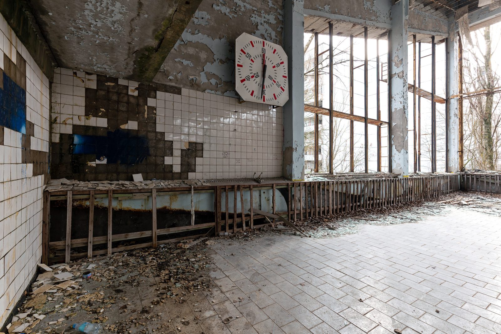 En 1998, après une inspection sanitaire, la piscine est définitivement fermée. Depuis, le temps a fait son œuvre : l’eau s’est évaporée, les carreaux se sont fissurés, les vitres ont volé en éclats et la végétation a commencé à envahir les lieux. Aujourd’hui, la Piscine Azure est l’un des spots les plus emblématiques et photographiés de la zone d’exclusion de Tchernobyl, symbole poignant de la vie interrompue et de la résilience humaine.