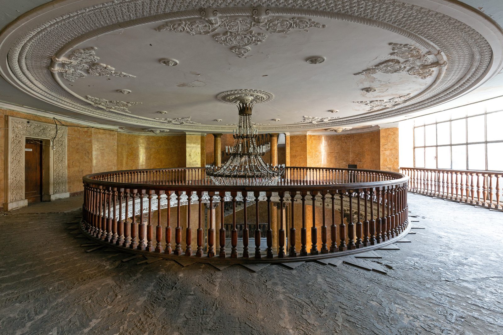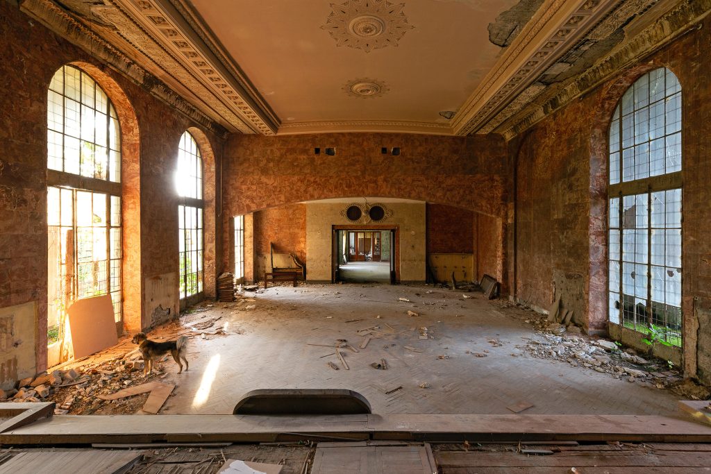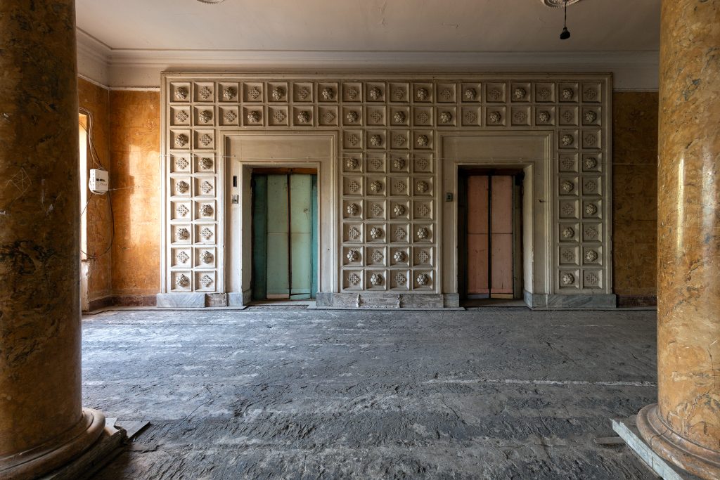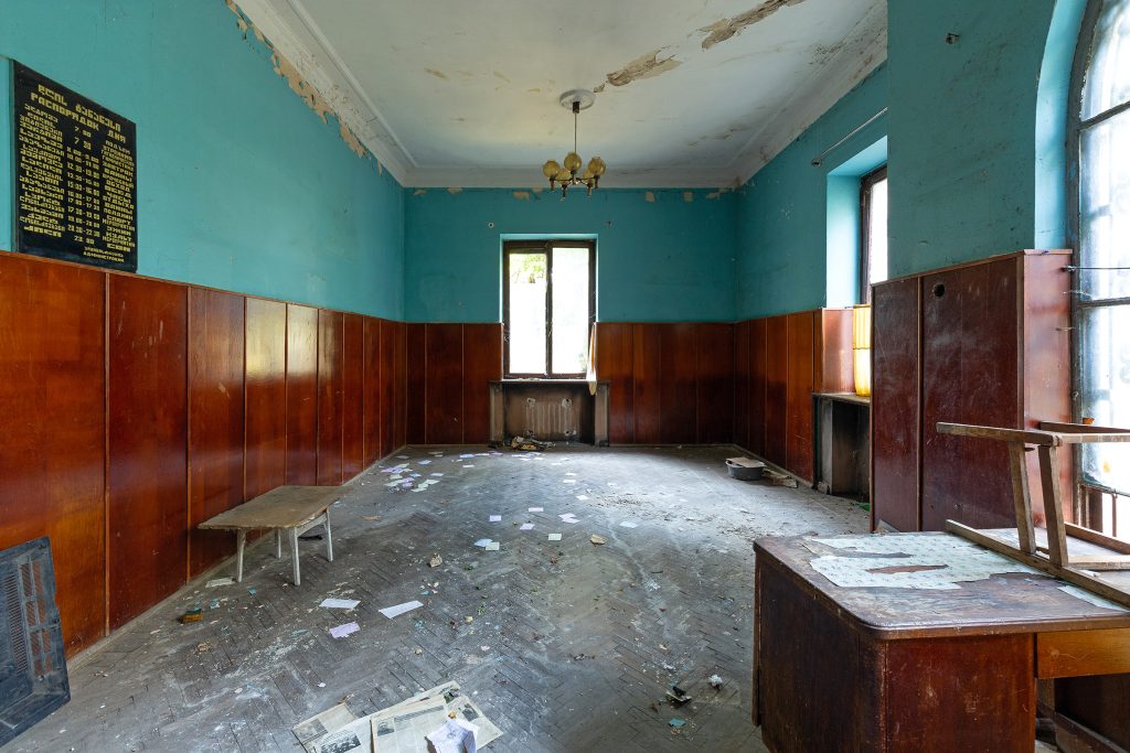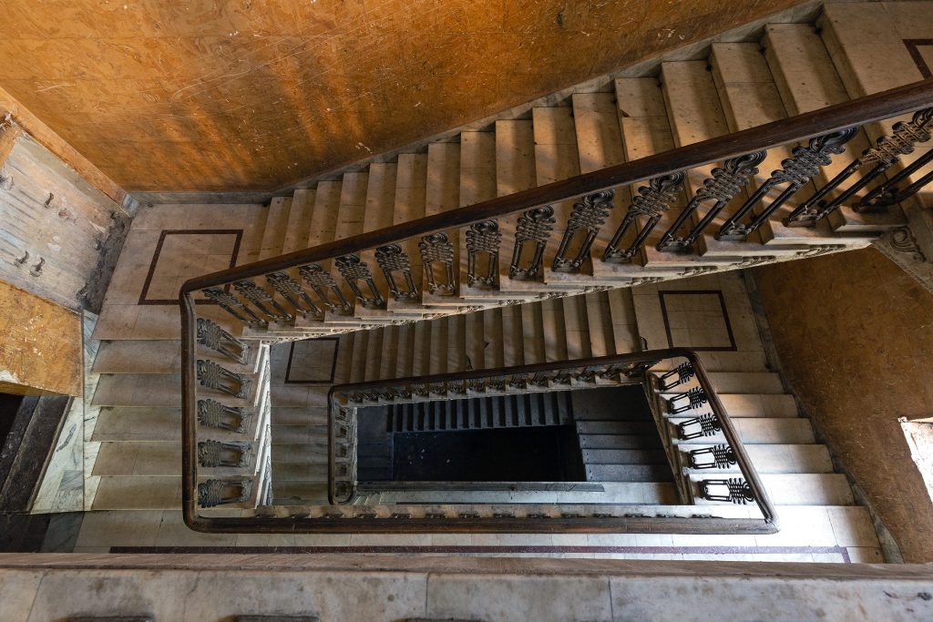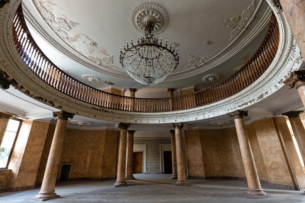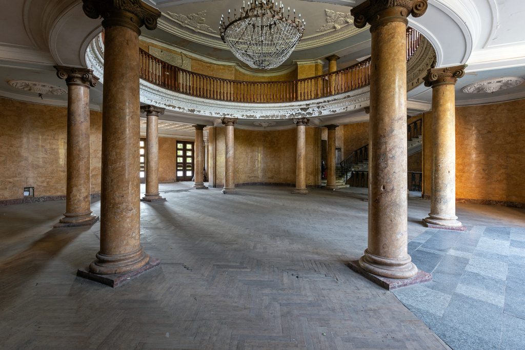 Malgré le temps et le manque d’entretien, le Metalurgi reste l’un des mieux préservés de la ville. Son grand vestibule circulaire avec son lustre imposant, ses marbres qui se dégradent lentement, ses balcons intérieurs et son immense salle de bal à l’arrière continuent de fasciner. La végétation envahit les jardins autrefois impeccables, et certaines pièces offrent une atmosphère particulièrement mélancolique, entre grandeur déchue et traces de vie quotidienne.