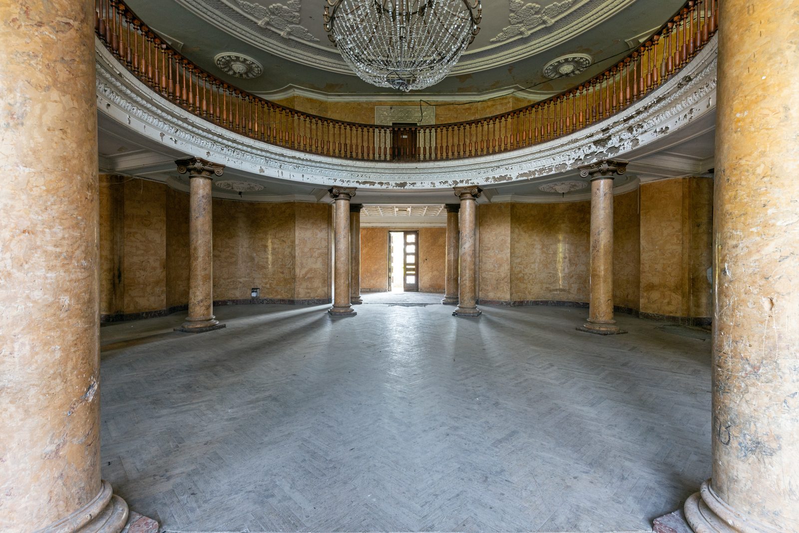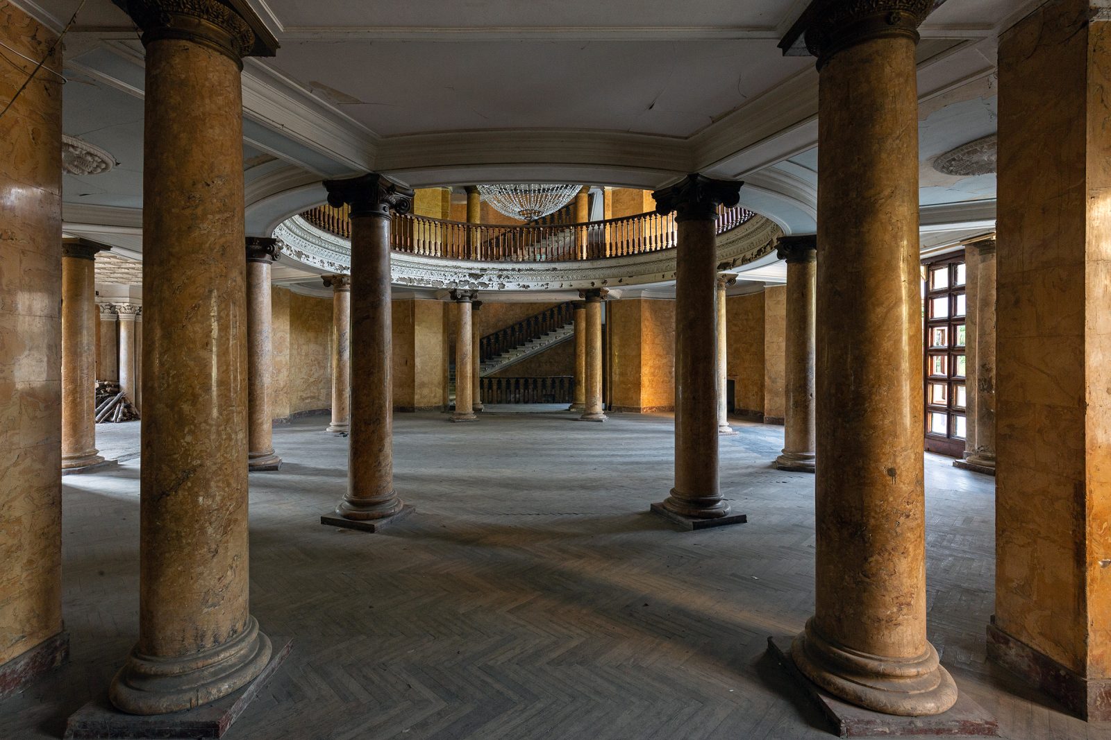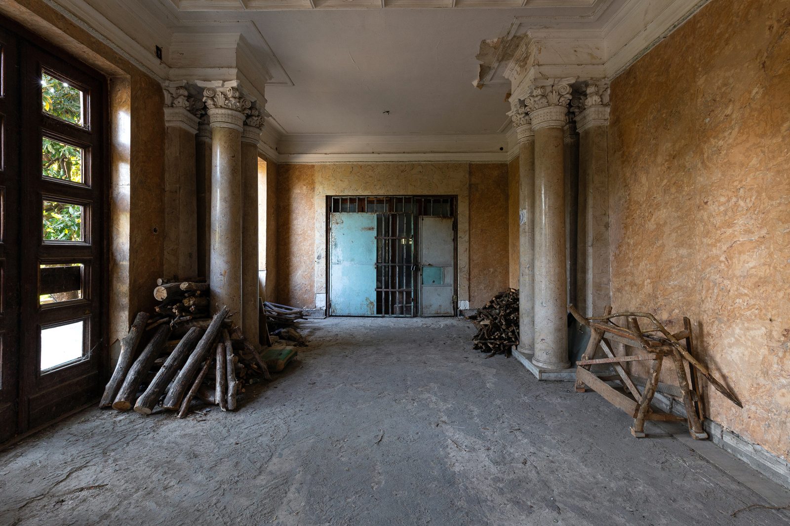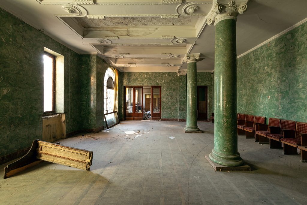 Malgré le temps et le manque d’entretien, le Metalurgi reste l’un des mieux préservés de la ville. Son grand vestibule circulaire avec son lustre imposant, ses marbres qui se dégradent lentement, ses balcons intérieurs et son immense salle de bal à l’arrière continuent de fasciner. La végétation envahit les jardins autrefois impeccables, et certaines pièces offrent une atmosphère particulièrement mélancolique, entre grandeur déchue et traces de vie quotidienne.