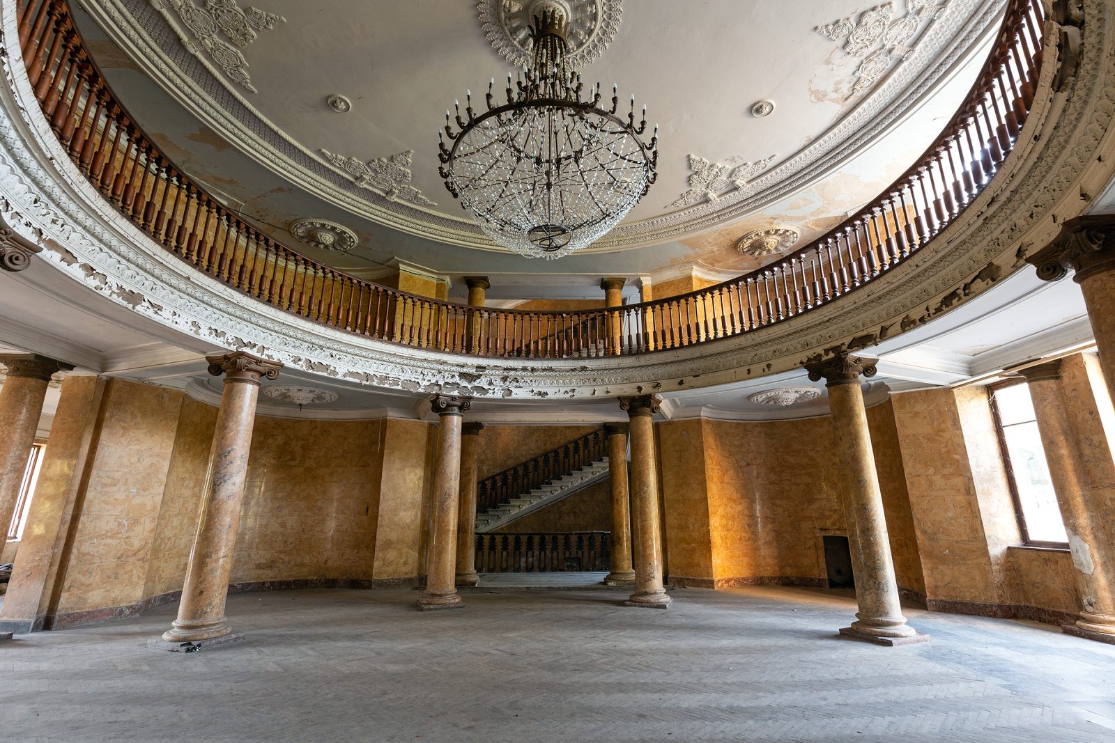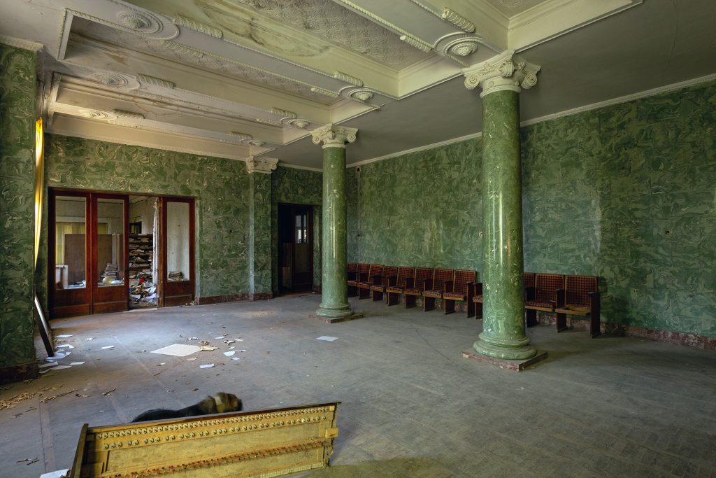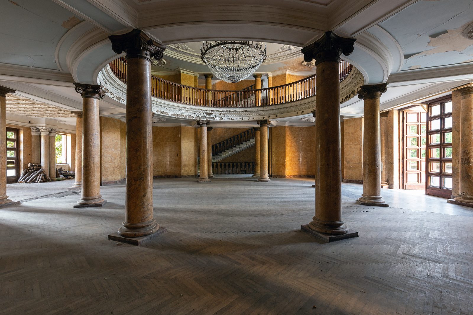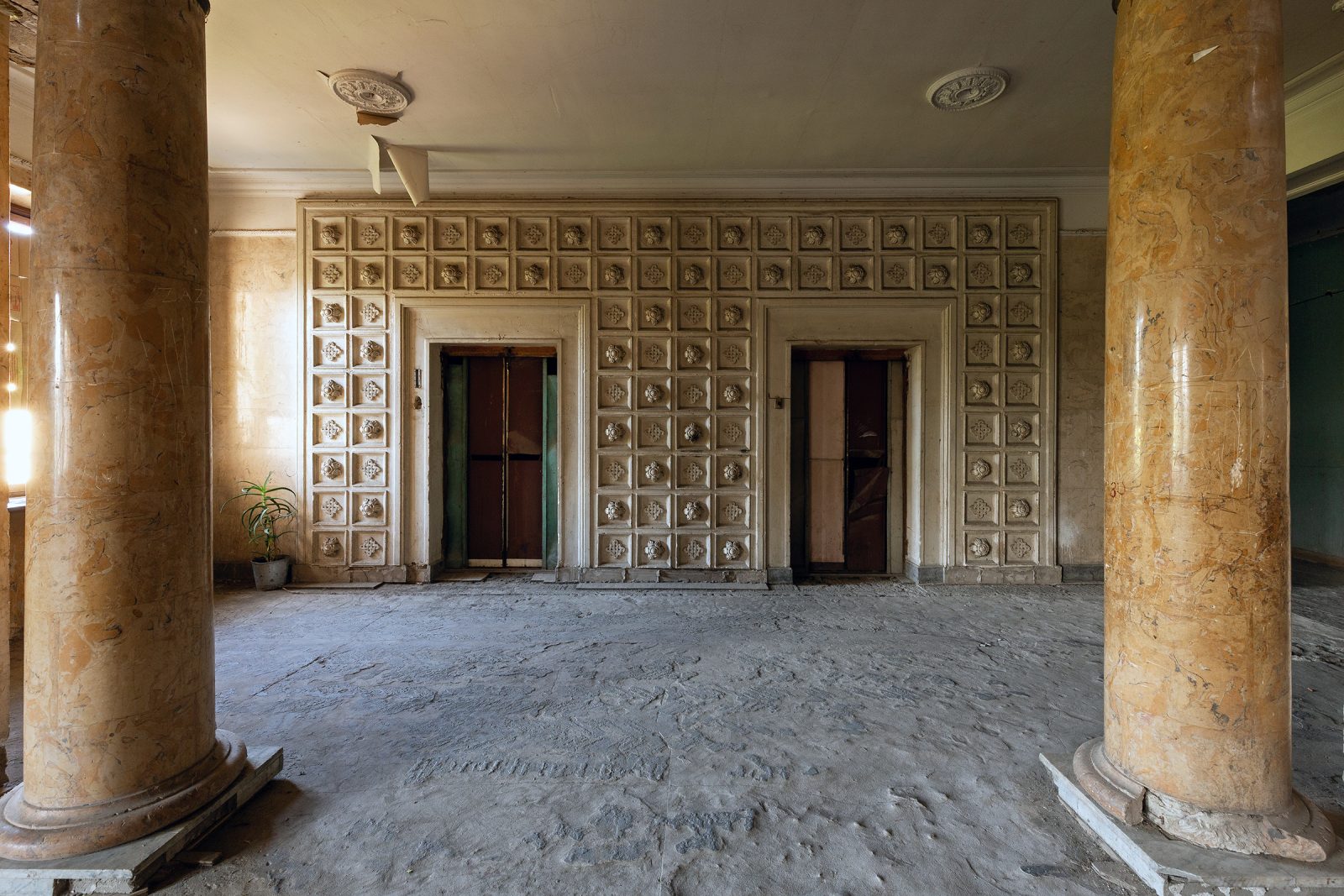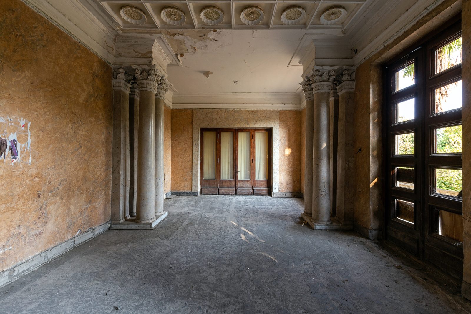 Malgré le temps et le manque d’entretien, le Metalurgi reste l’un des mieux préservés de la ville. Son grand vestibule circulaire avec son lustre imposant, ses marbres qui se dégradent lentement, ses balcons intérieurs et son immense salle de bal à l’arrière continuent de fasciner. La végétation envahit les jardins autrefois impeccables, et certaines pièces offrent une atmosphère particulièrement mélancolique, entre grandeur déchue et traces de vie quotidienne.