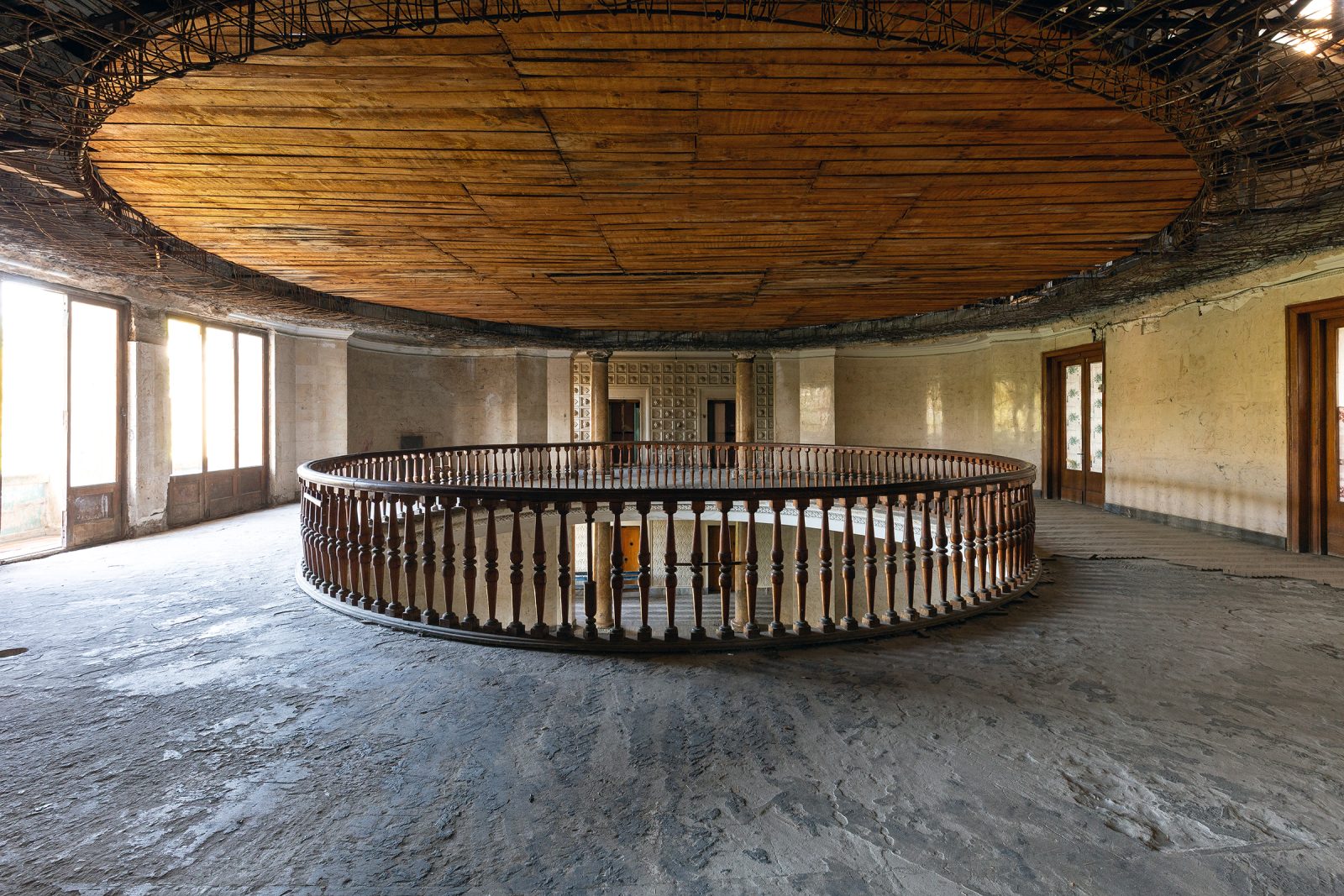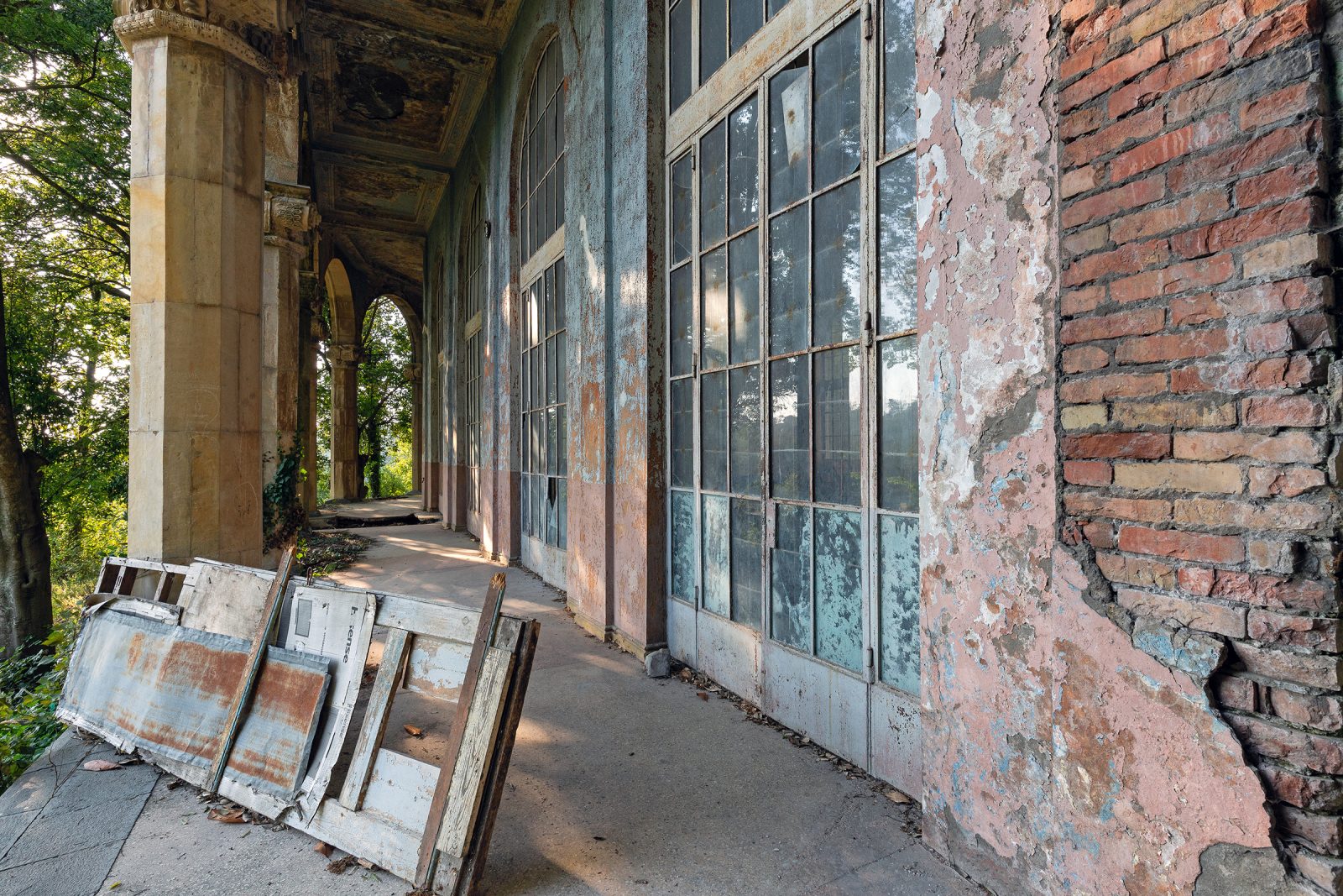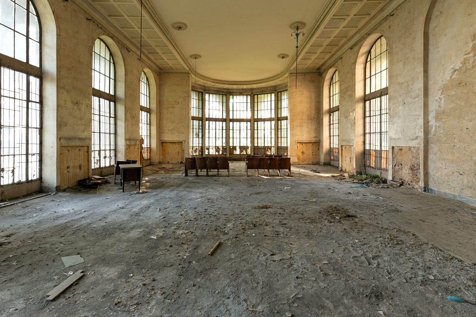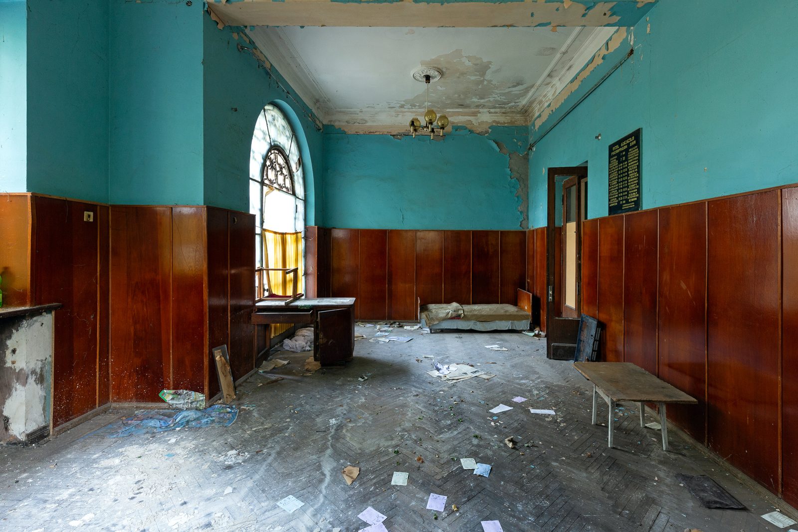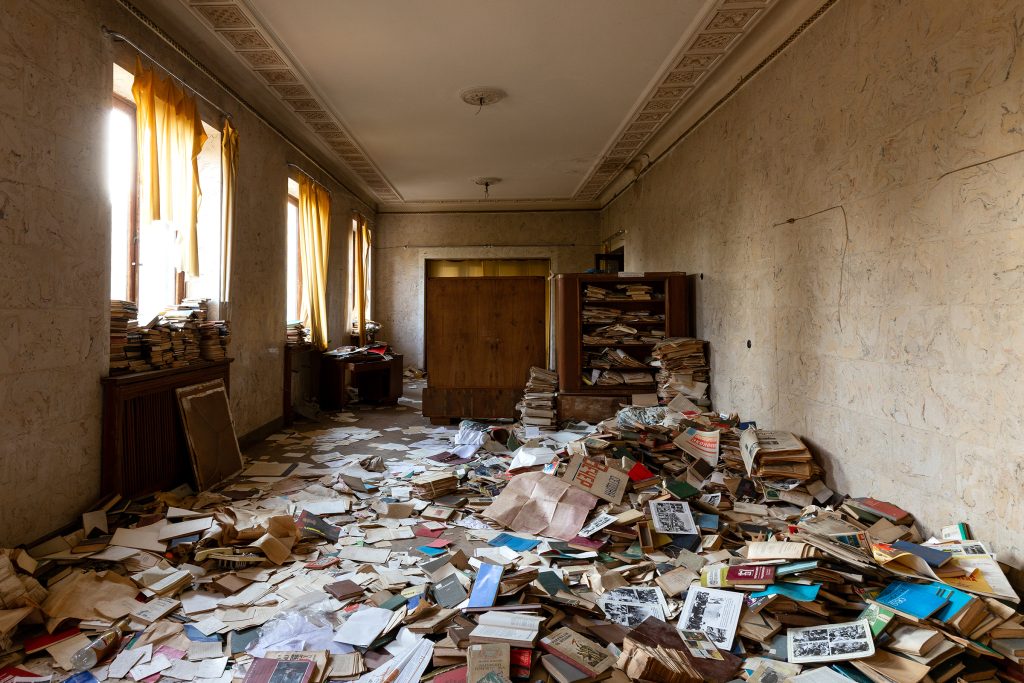 Malgré le temps et le manque d’entretien, le Metalurgi reste l’un des mieux préservés de la ville. Son grand vestibule circulaire avec son lustre imposant, ses marbres qui se dégradent lentement, ses balcons intérieurs et son immense salle de bal à l’arrière continuent de fasciner. La végétation envahit les jardins autrefois impeccables, et certaines pièces offrent une atmosphère particulièrement mélancolique, entre grandeur déchue et traces de vie quotidienne.