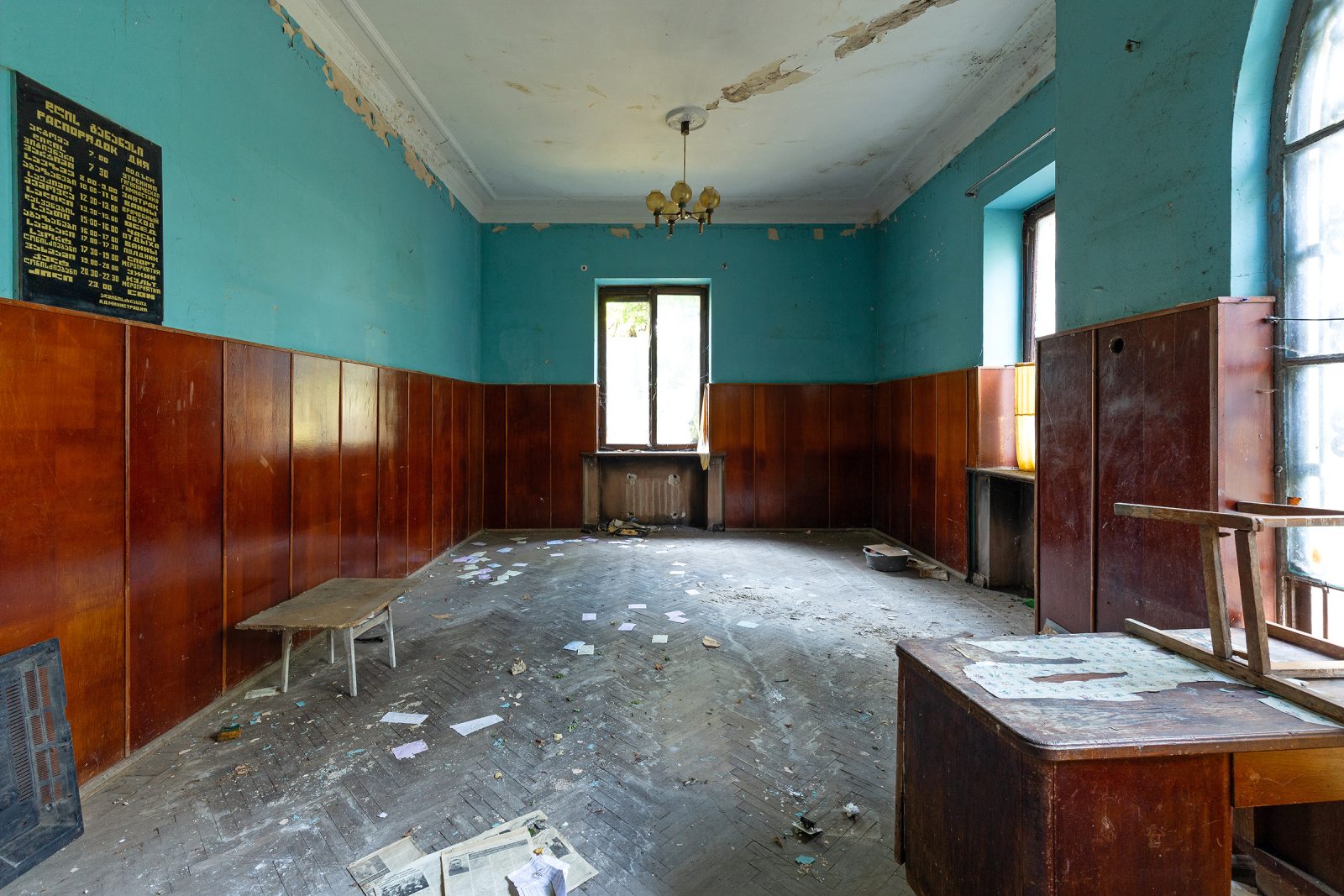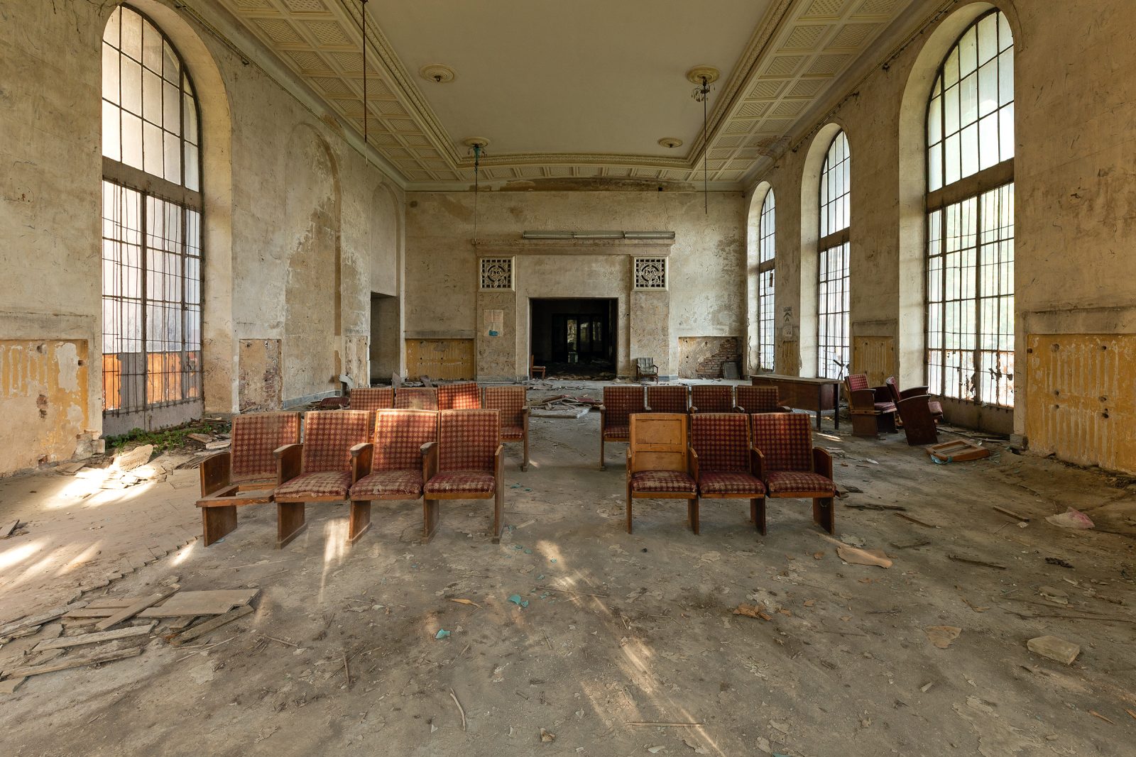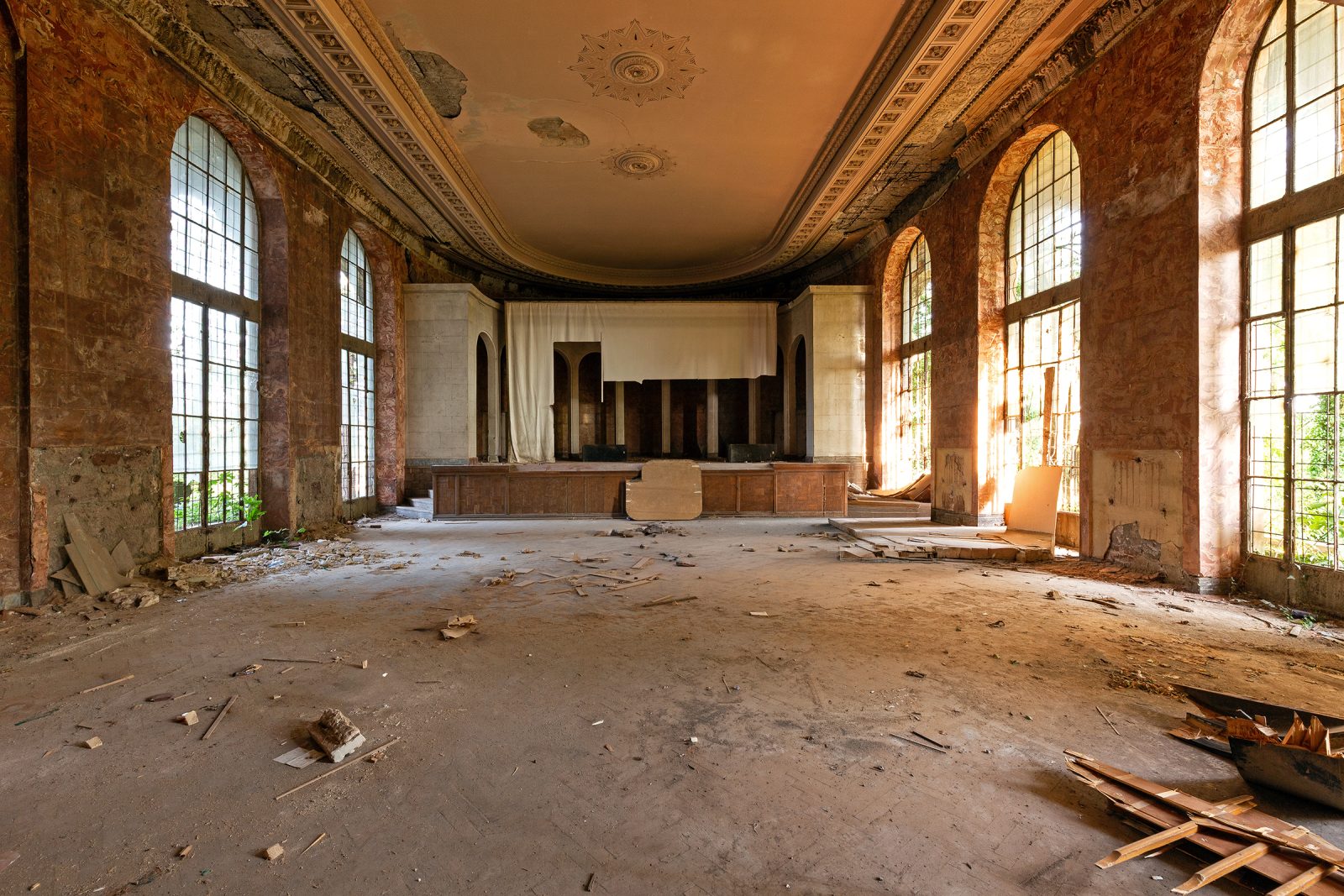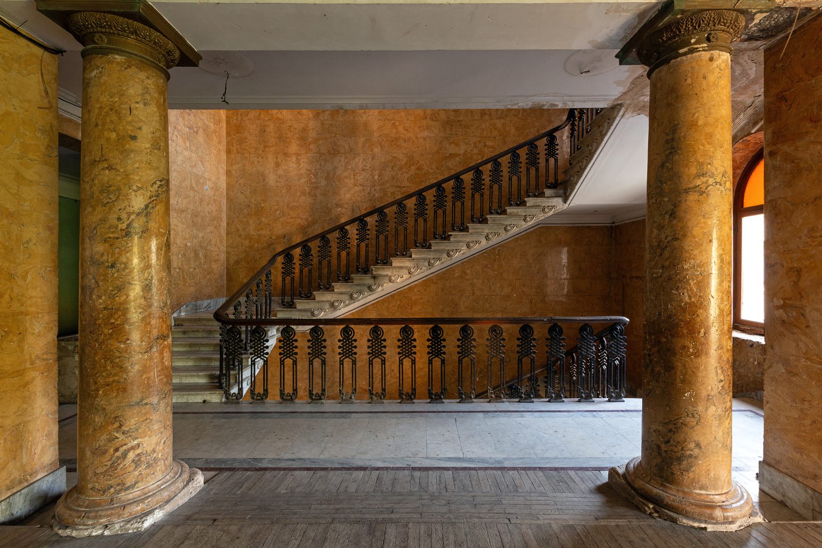 Malgré le temps et le manque d’entretien, le Metalurgi reste l’un des mieux préservés de la ville. Son grand vestibule circulaire avec son lustre imposant, ses marbres qui se dégradent lentement, ses balcons intérieurs et son immense salle de bal à l’arrière continuent de fasciner. La végétation envahit les jardins autrefois impeccables, et certaines pièces offrent une atmosphère particulièrement mélancolique, entre grandeur déchue et traces de vie quotidienne.