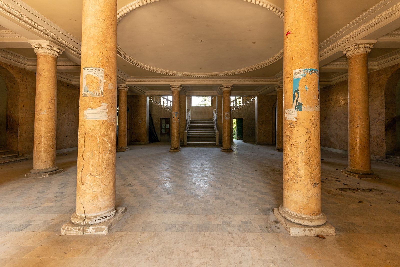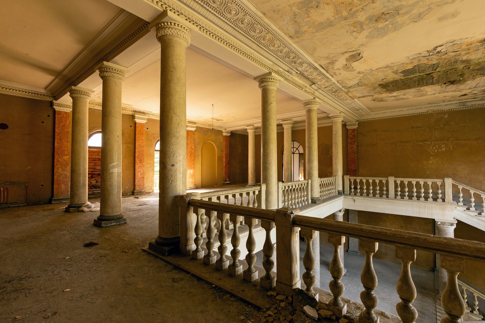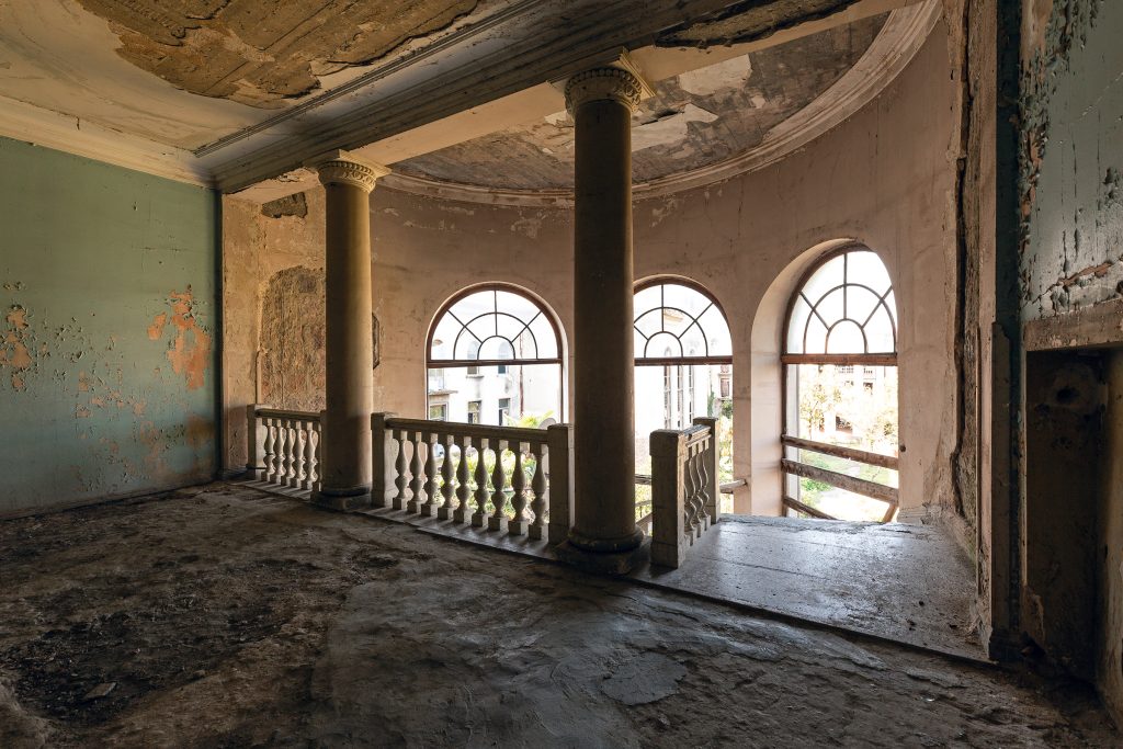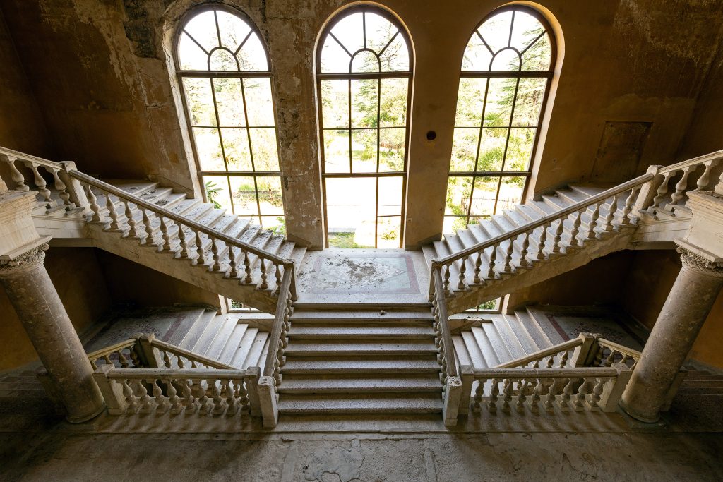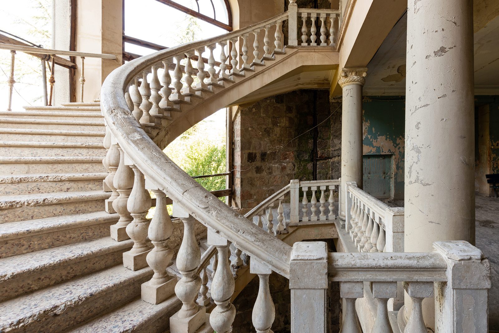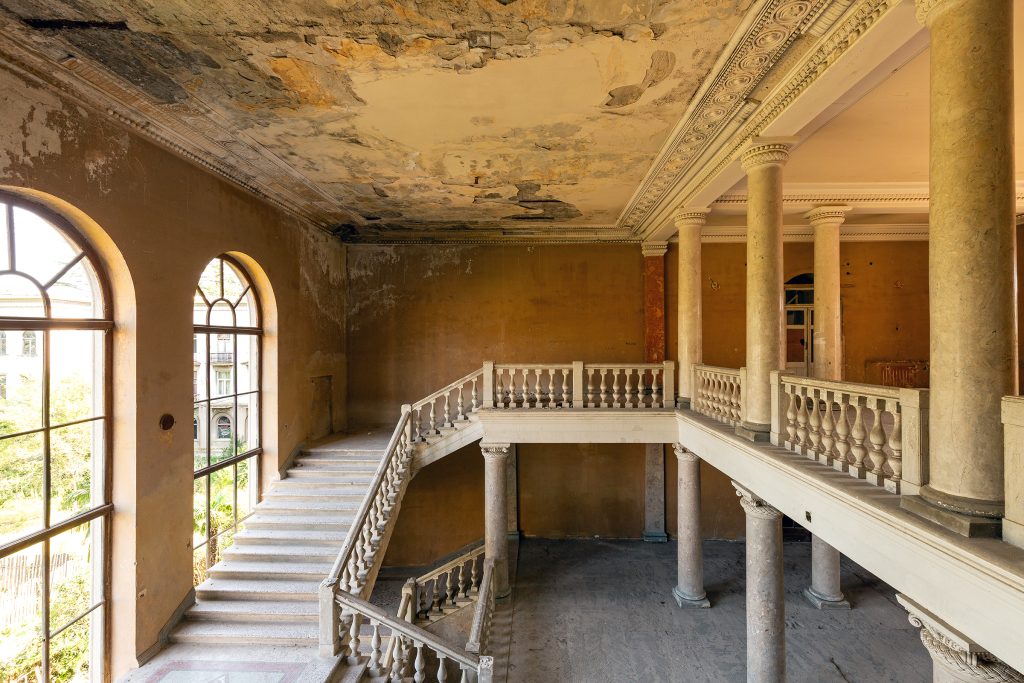Aujourd’hui, l’Imereti reste partiellement habité par ces familles déplacées. Certaines ailes sont en ruine avancée – planchers effondrés, balcons menaçants –, tandis que d’autres parties conservent une étonnante grandeur : escaliers monumentaux, colonnes de marbre qui s’effritent lentement, moulures délicates sous la peinture qui pèle, et cette rotonde emblématique où la lumière filtre à travers les fenêtres brisées.
