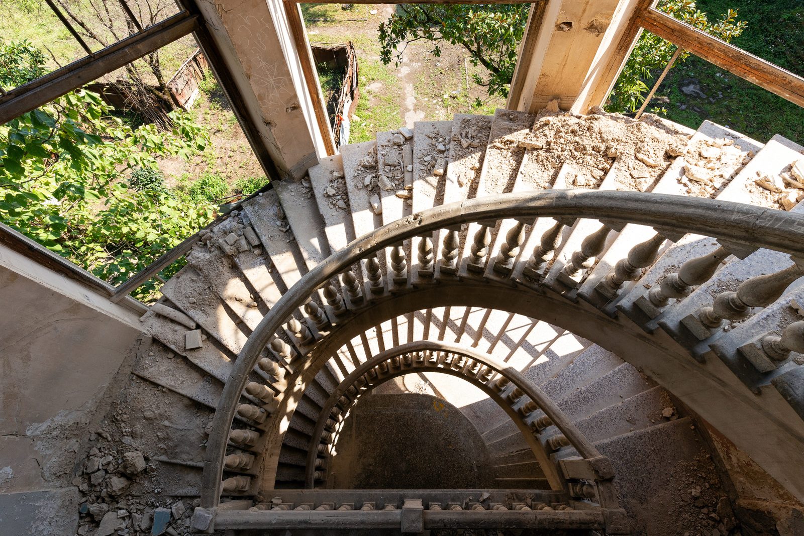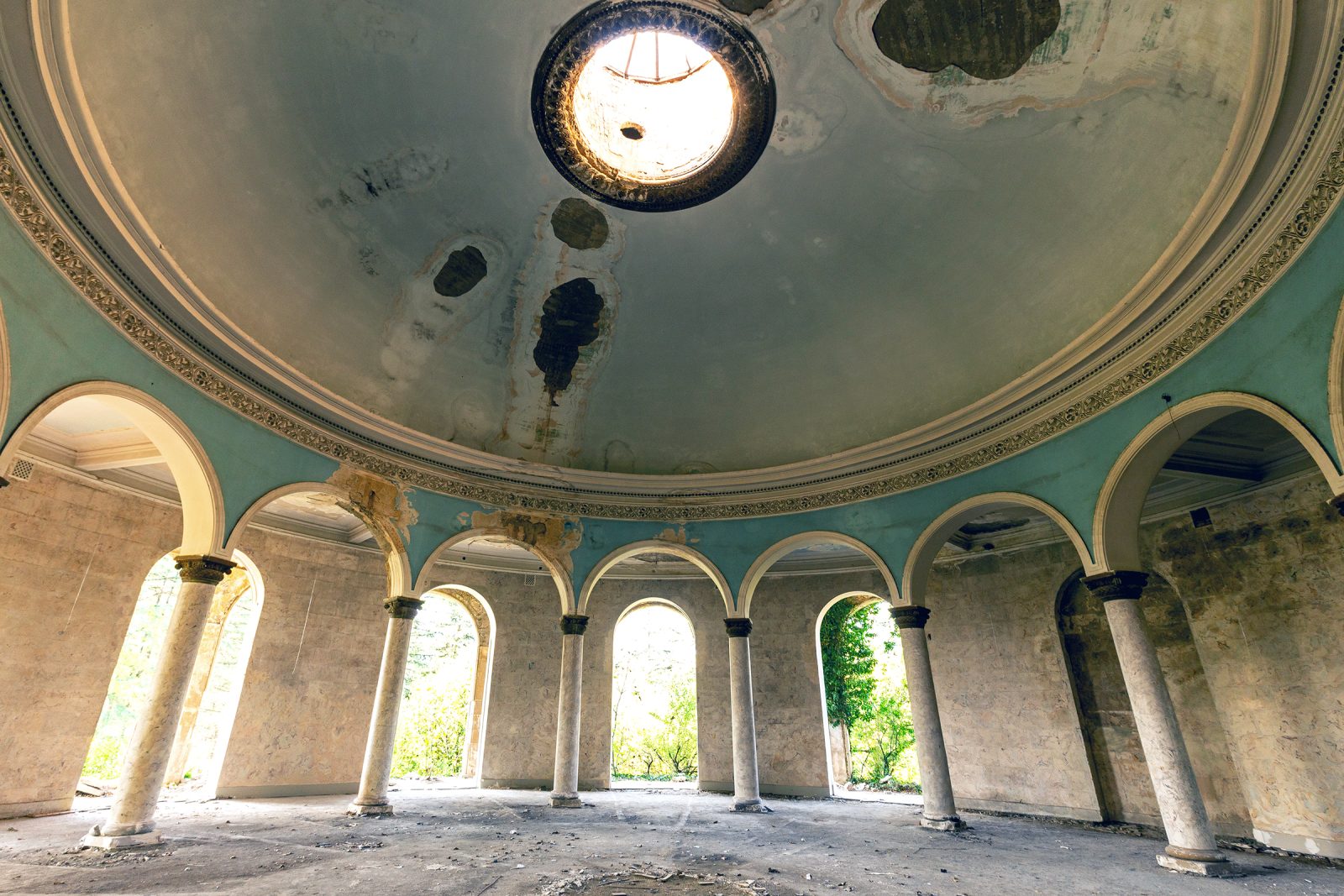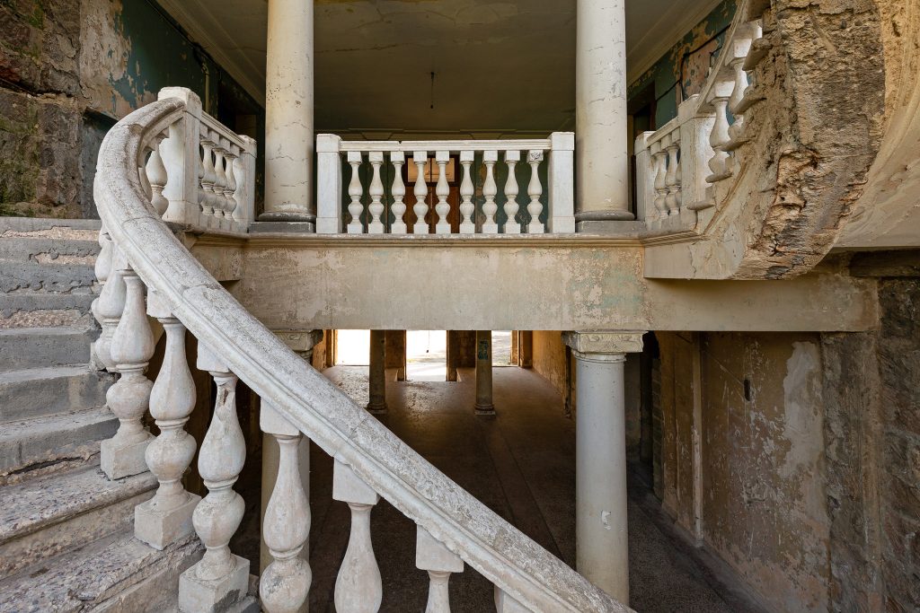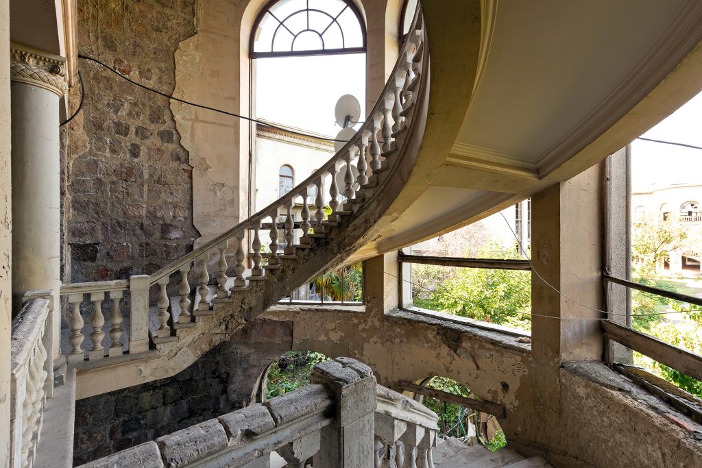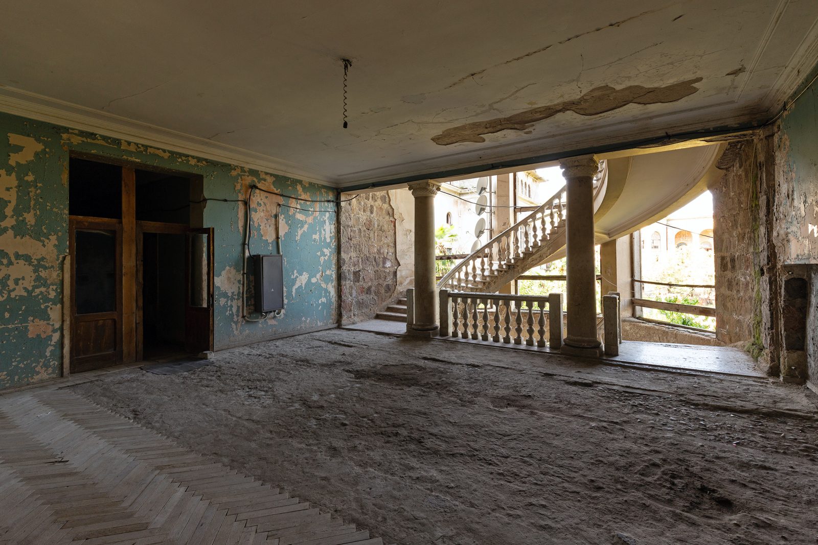Aujourd’hui, l’Imereti reste partiellement habité par ces familles déplacées. Certaines ailes sont en ruine avancée – planchers effondrés, balcons menaçants –, tandis que d’autres parties conservent une étonnante grandeur : escaliers monumentaux, colonnes de marbre qui s’effritent lentement, moulures délicates sous la peinture qui pèle, et cette rotonde emblématique où la lumière filtre à travers les fenêtres brisées.