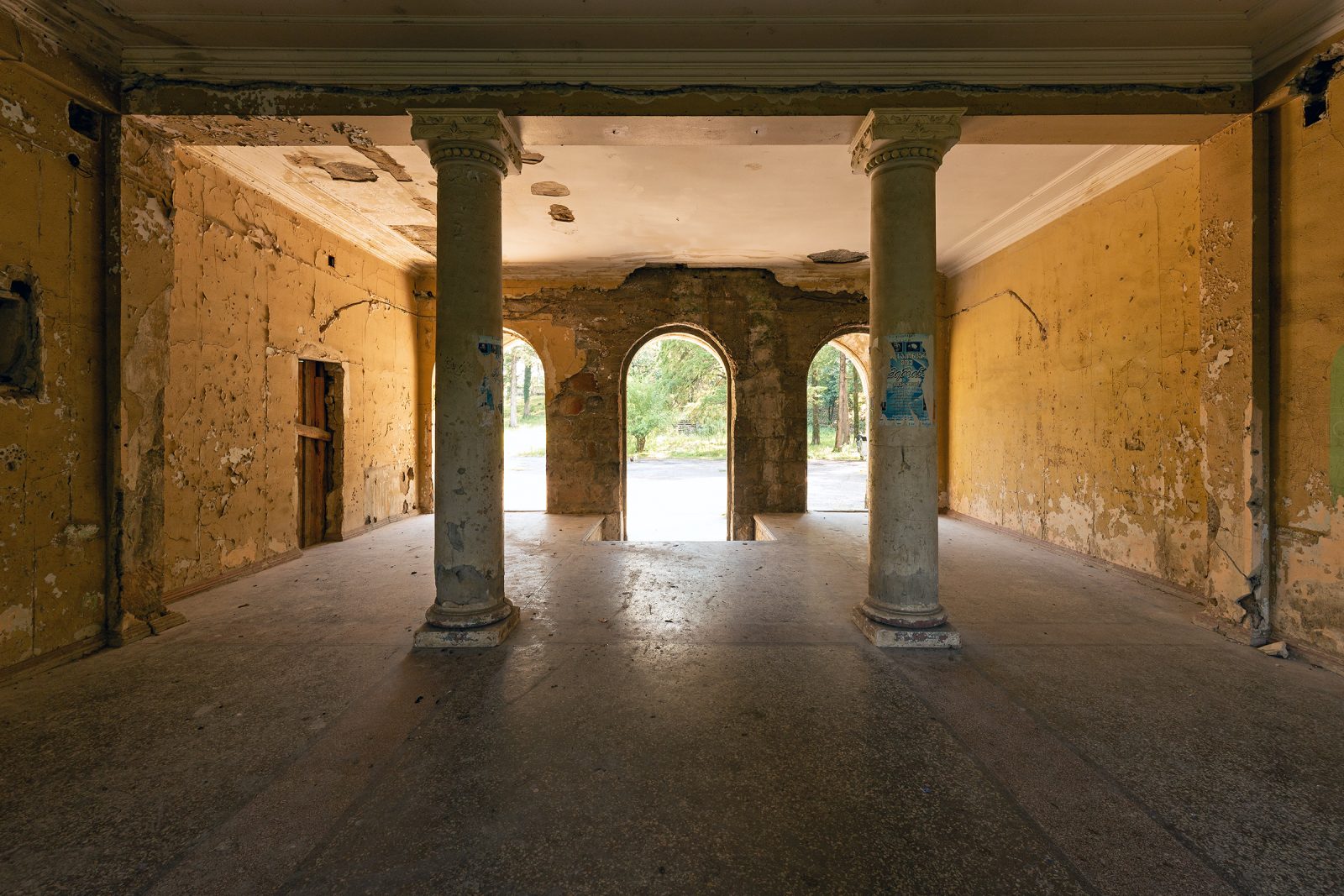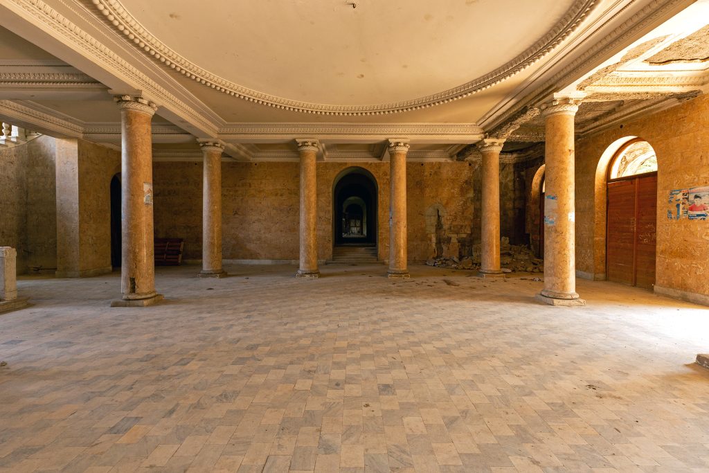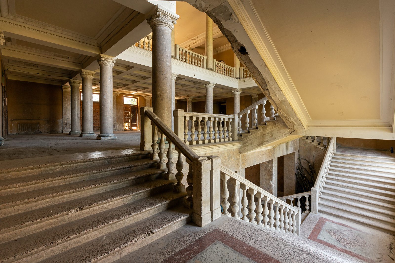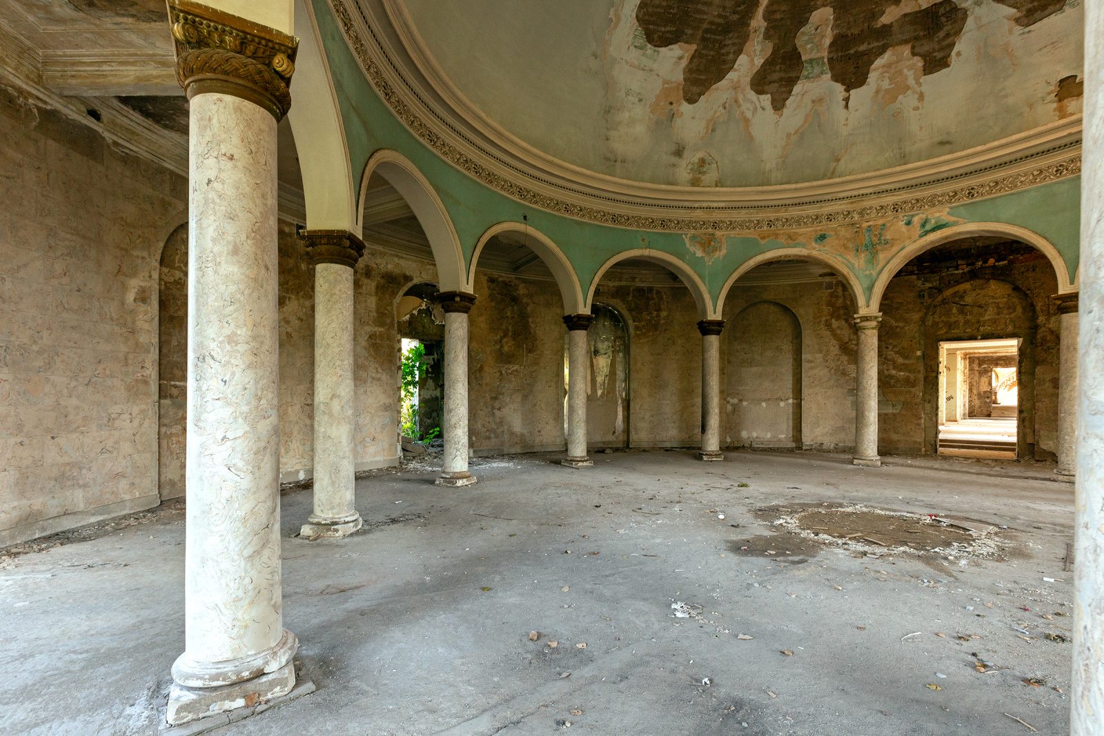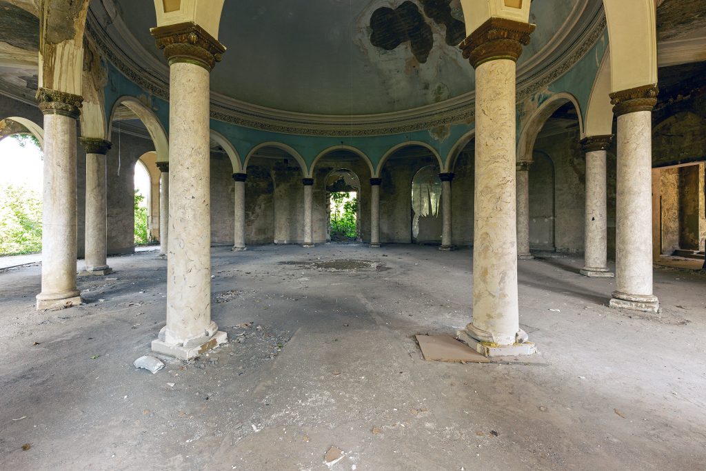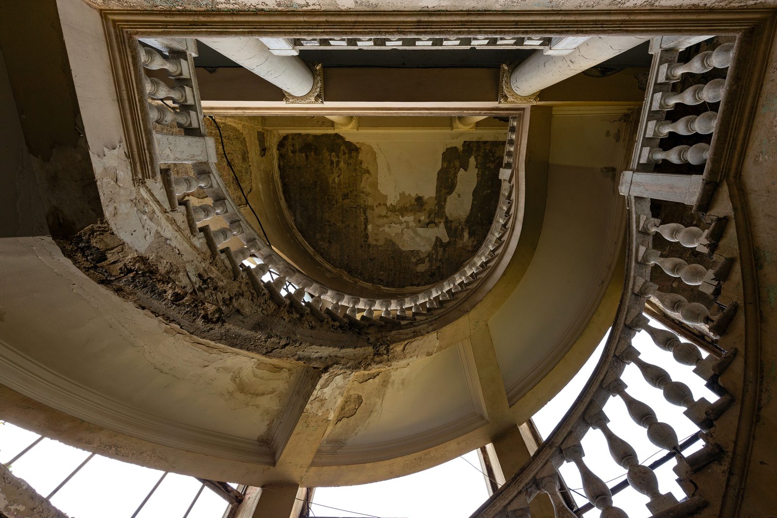 Aujourd’hui, l’Imereti reste partiellement habité par ces familles déplacées. Certaines ailes sont en ruine avancée – planchers effondrés, balcons menaçants –, tandis que d’autres parties conservent une étonnante grandeur : escaliers monumentaux, colonnes de marbre qui s’effritent lentement, moulures délicates sous la peinture qui pèle, et cette rotonde emblématique où la lumière filtre à travers les fenêtres brisées.