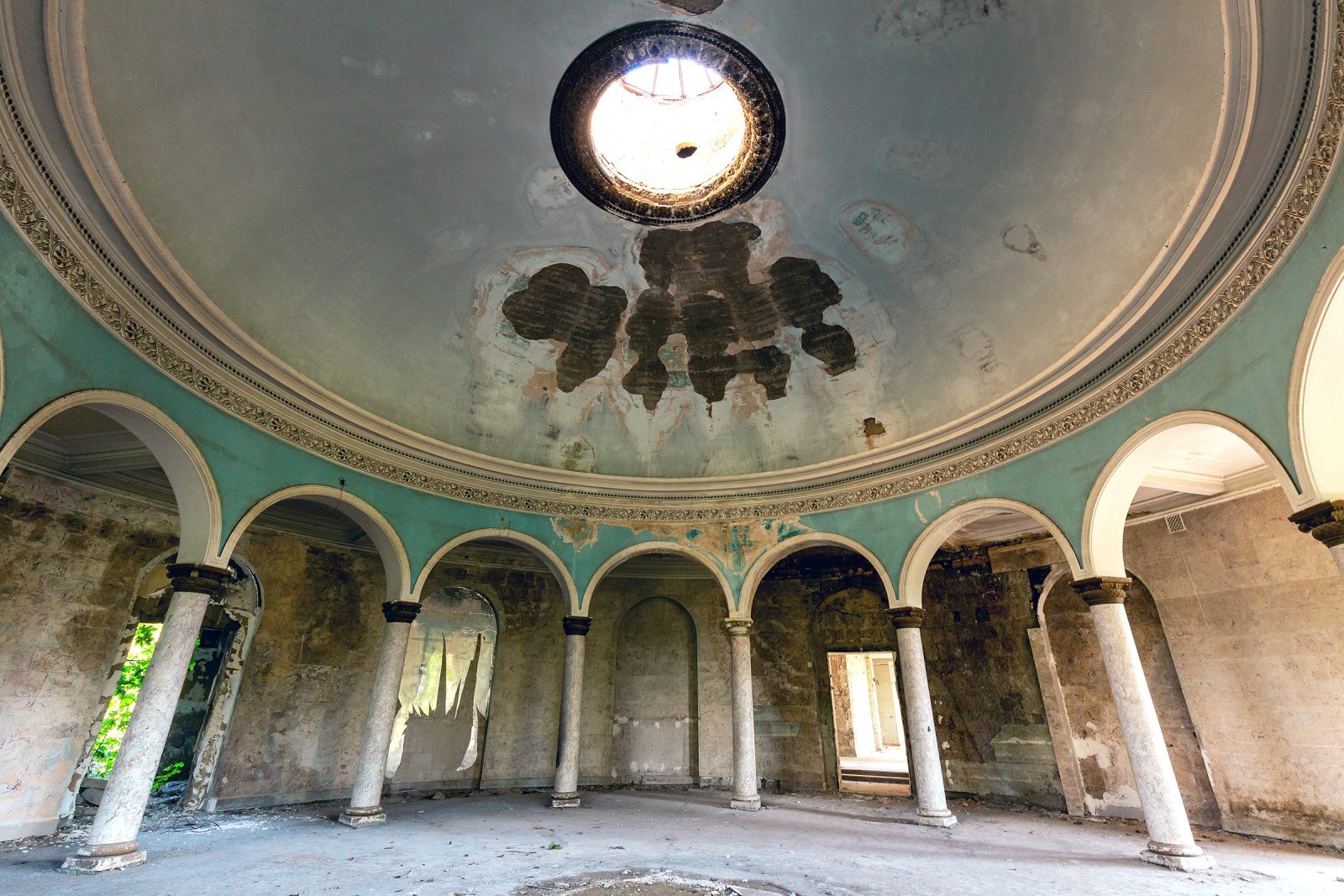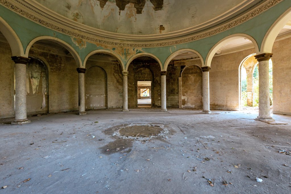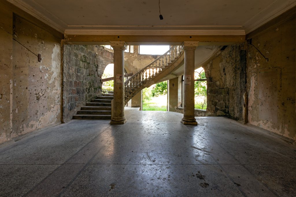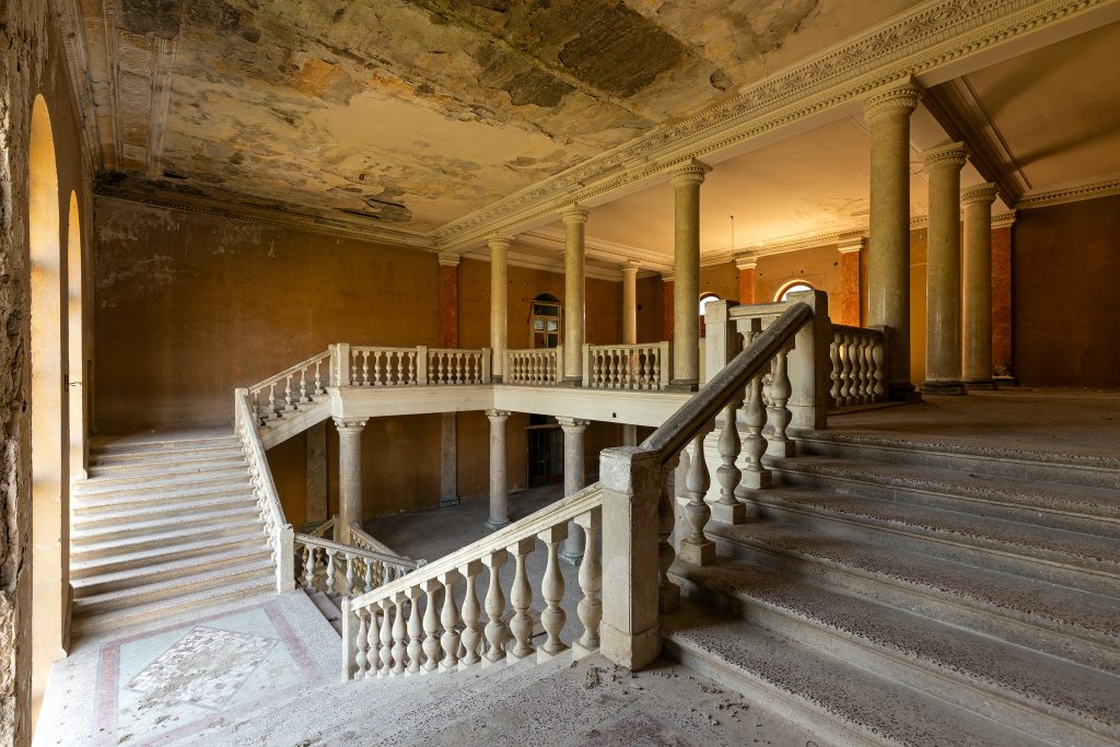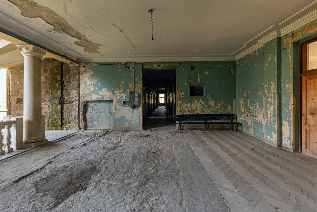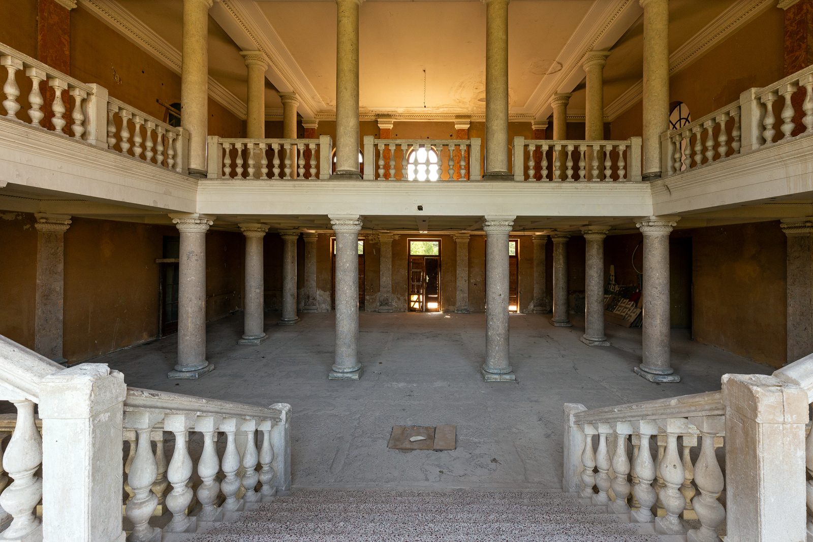 Aujourd’hui, l’Imereti reste partiellement habité par ces familles déplacées. Certaines ailes sont en ruine avancée – planchers effondrés, balcons menaçants –, tandis que d’autres parties conservent une étonnante grandeur : escaliers monumentaux, colonnes de marbre qui s’effritent lentement, moulures délicates sous la peinture qui pèle, et cette rotonde emblématique où la lumière filtre à travers les fenêtres brisées.