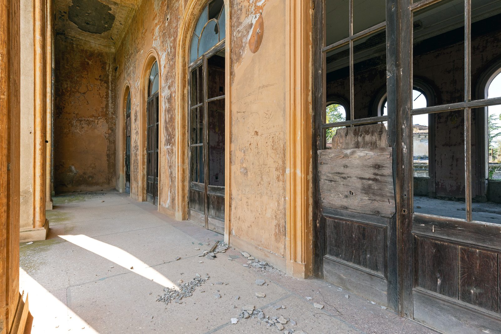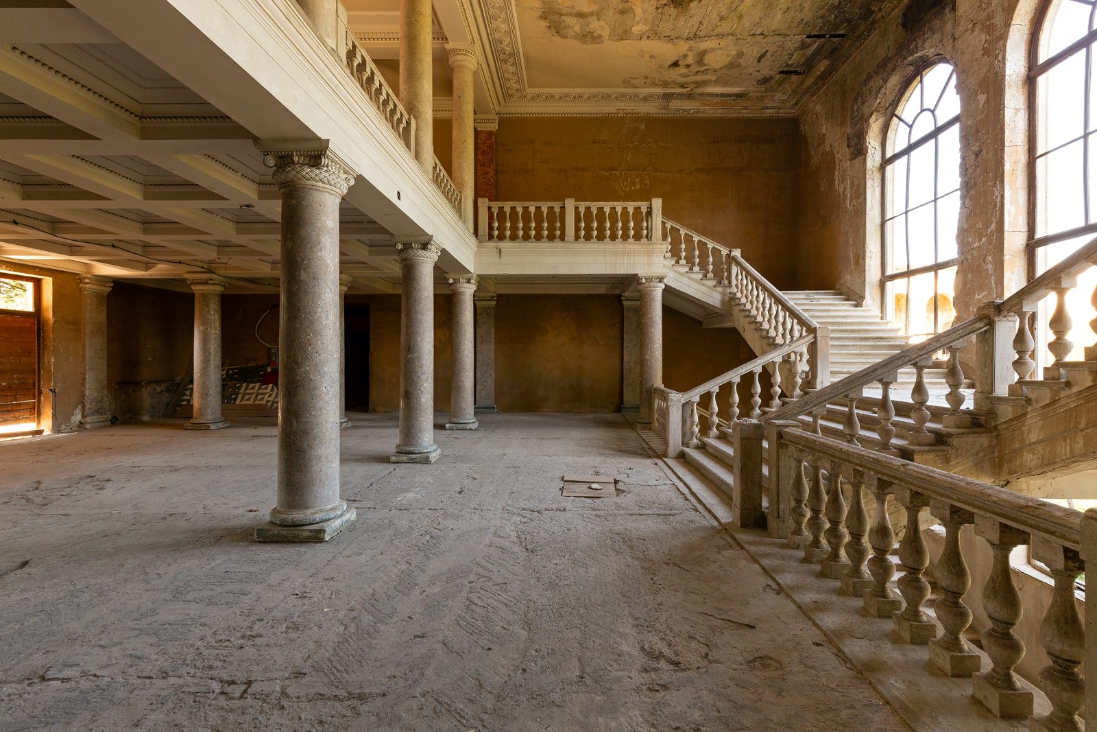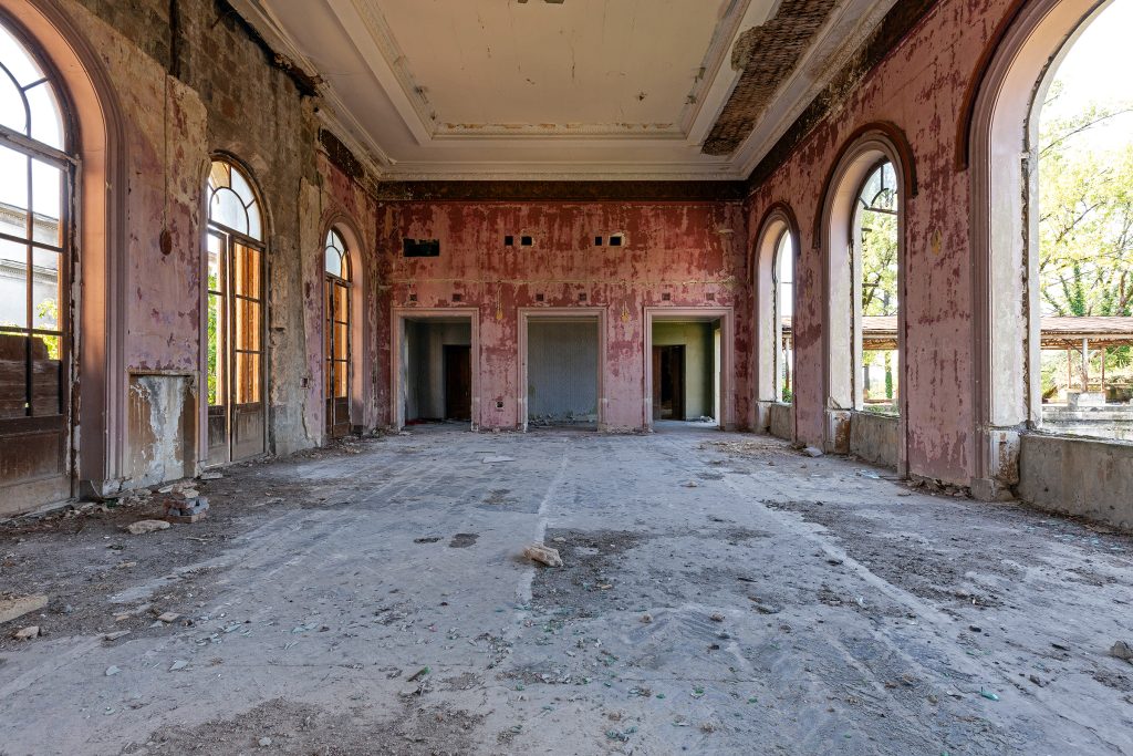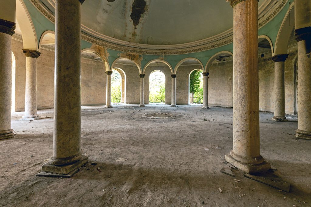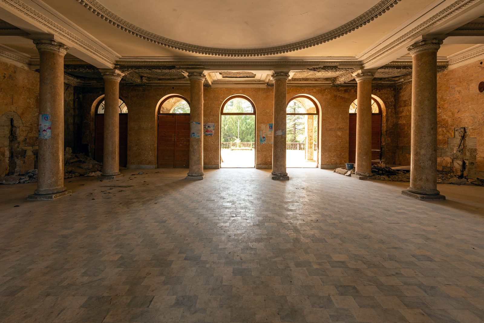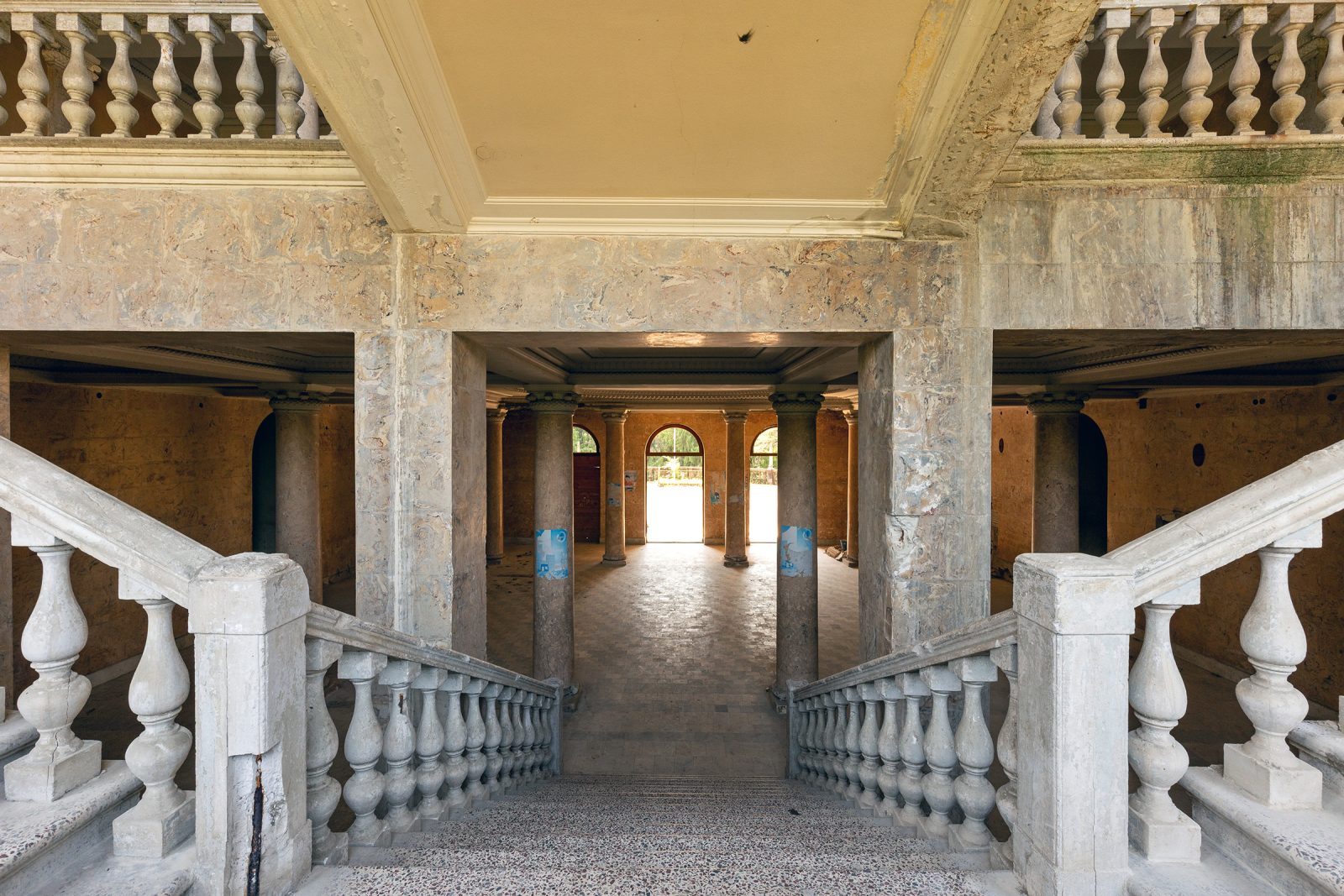 Aujourd’hui, l’Imereti reste partiellement habité par ces familles déplacées. Certaines ailes sont en ruine avancée – planchers effondrés, balcons menaçants –, tandis que d’autres parties conservent une étonnante grandeur : escaliers monumentaux, colonnes de marbre qui s’effritent lentement, moulures délicates sous la peinture qui pèle, et cette rotonde emblématique où la lumière filtre à travers les fenêtres brisées.