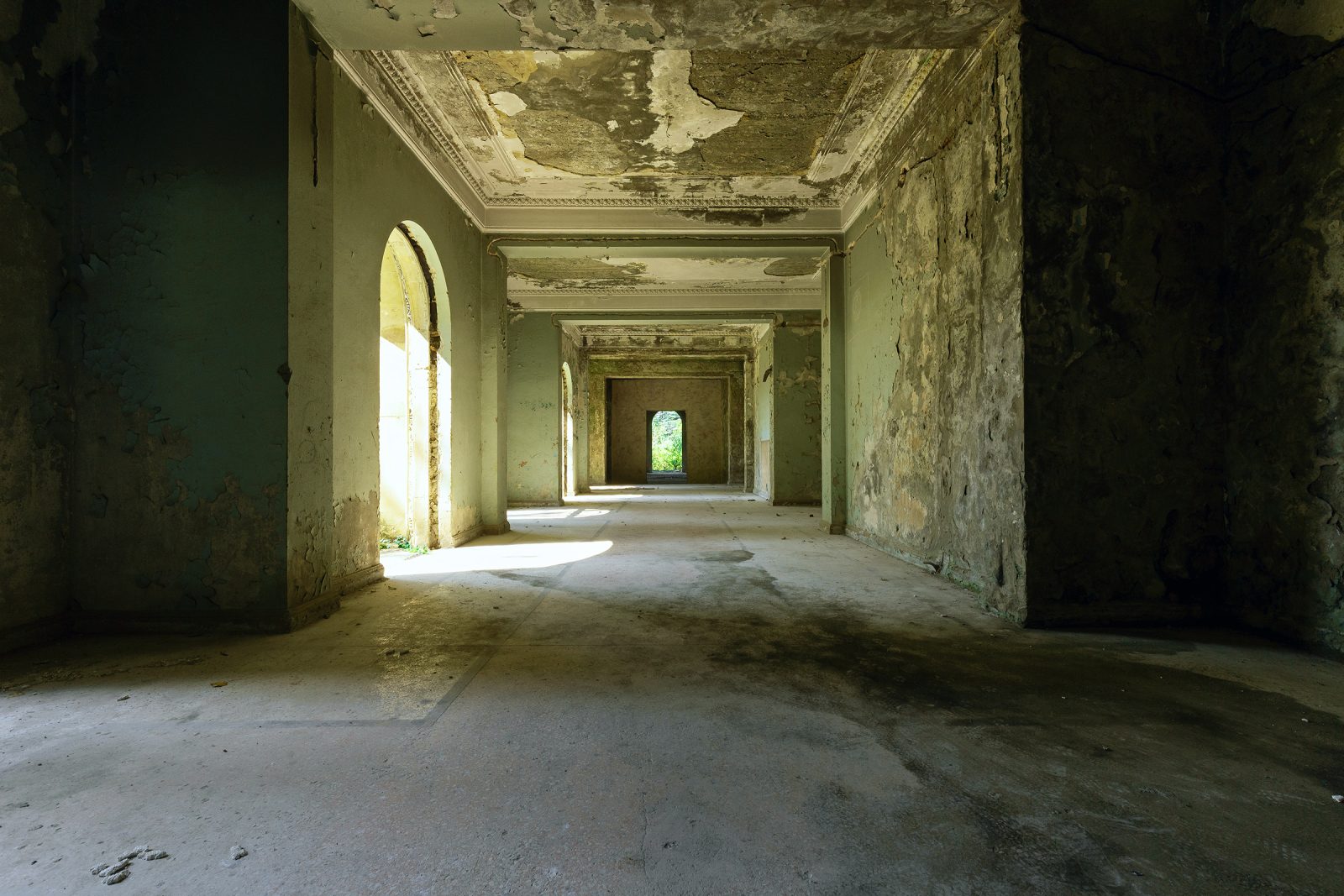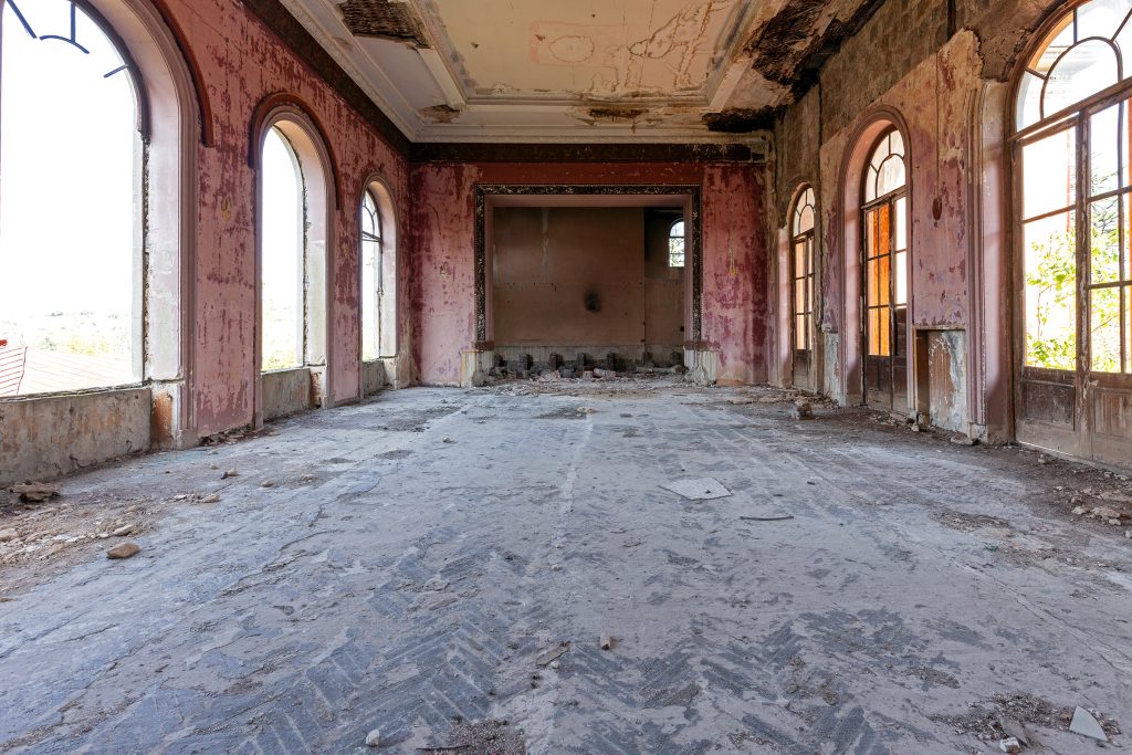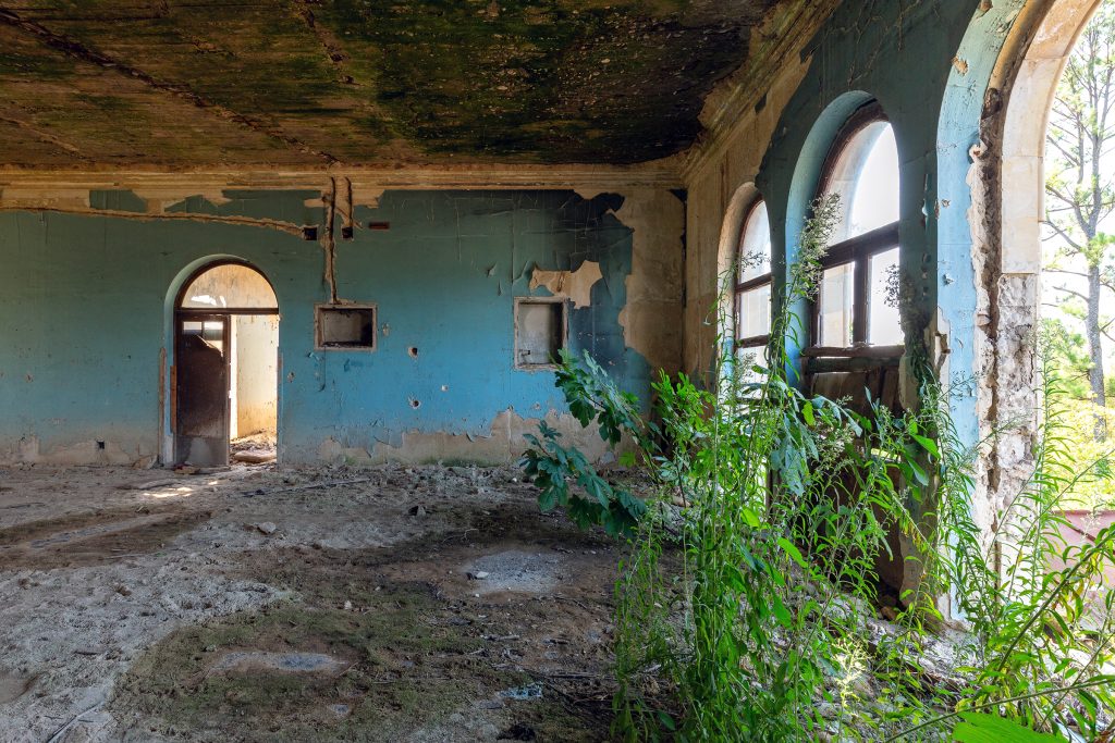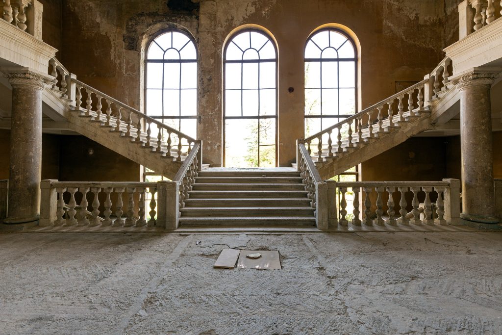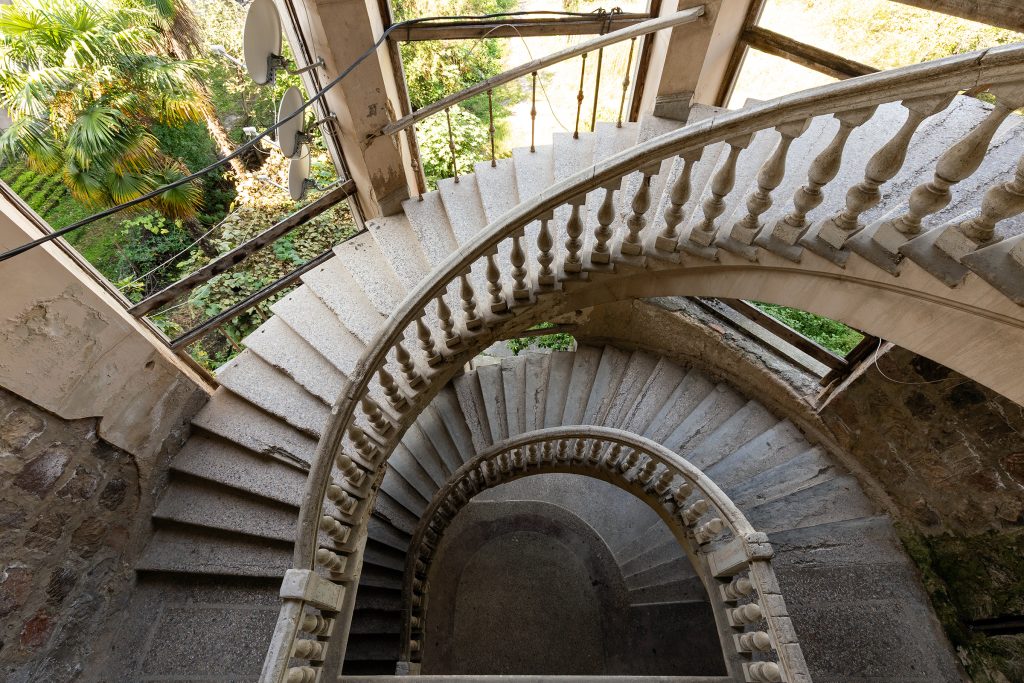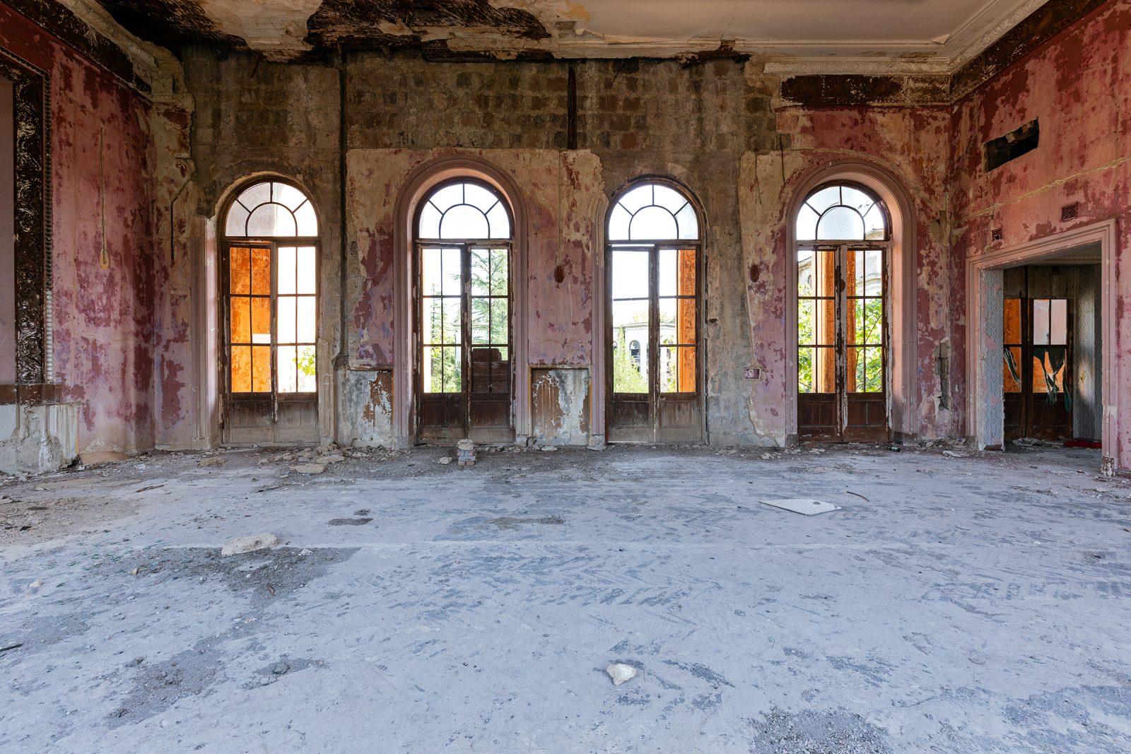 Aujourd’hui, l’Imereti reste partiellement habité par ces familles déplacées. Certaines ailes sont en ruine avancée – planchers effondrés, balcons menaçants –, tandis que d’autres parties conservent une étonnante grandeur : escaliers monumentaux, colonnes de marbre qui s’effritent lentement, moulures délicates sous la peinture qui pèle, et cette rotonde emblématique où la lumière filtre à travers les fenêtres brisées.
